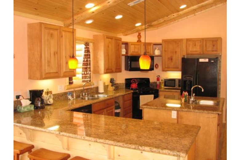 Kitchen is fully equipped and ready for all your cooking needs. Also we have to mention that cabin is handicap friendly with wheelchair ramp from driveway, oversize door to disabled person bedroom and bathroom including walk in shower with no threshold big enough for wheelchair.