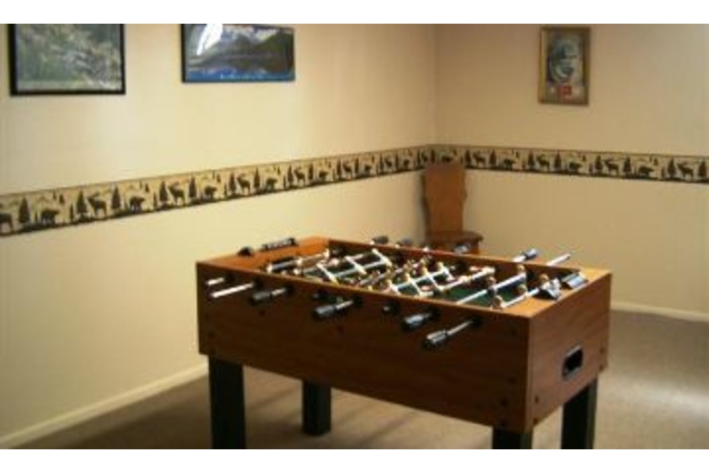 The living area has a wood burning fireplace and a TV with a DVD player. There is a queen sleeper sofa in the living room and a great deck just off of the living area. Down the hall are two bedrooms, one has a private bathroom. The lower level of the home has a bathroom with a shower and one bedroom along with a foosball table in the game room.Surrounding Description