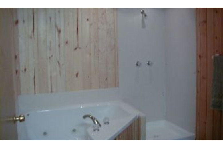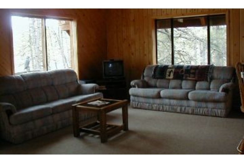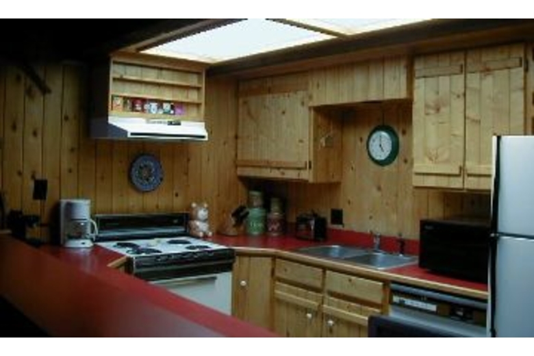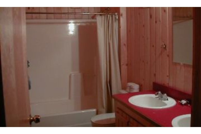 This is a three bedroom cabin with two full baths. The master bath has a huge jetted tub and a 2 person sauna. The house is completely furnished with washer/dryer, stove, oven, dishwasher, microwave, and most of your small appliances. Nice appliances, linens, dishes, ect!! It has a gas log fireplace in the living room (ambiance without the hassle)! The living room also has a sofa sleeper for extra sleeping. There is a 6-place dining room table with insert and 4 bar stools for the very long bar style countertop. There is Satellite Dish TV reception, with a VCR and a stereo system. The master bedroom has a queen bed with a full bath across the hall. Each bedroom upstairs has one queen and one twin, with a full bath between. And there is a sofa sleeper in the living room. There is a large deck off the living room with a bbq and lawn chairs.Surrounding Description