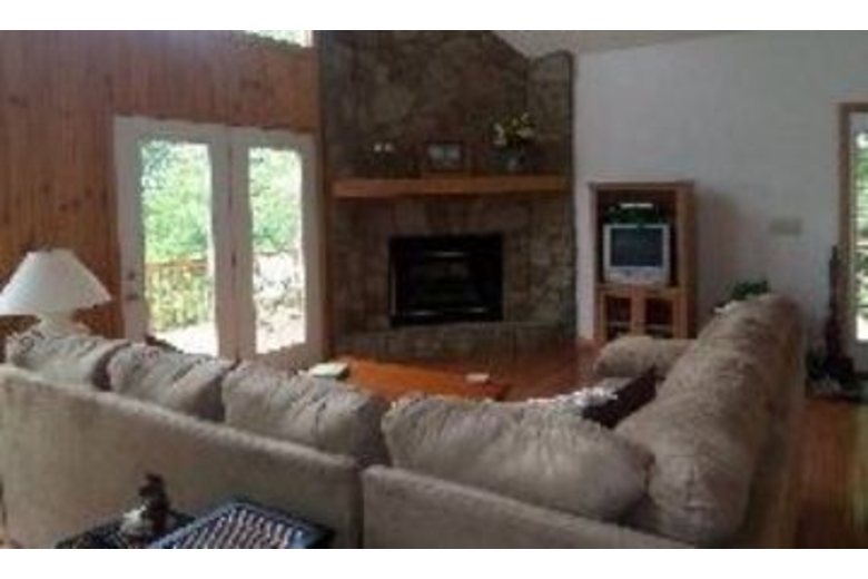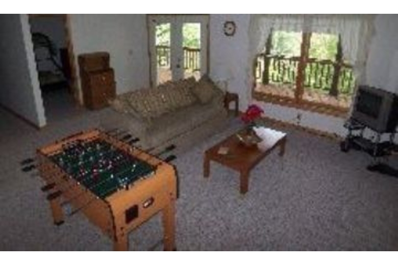 This cabin has four bedrooms and three bathrooms. There are queen beds in the first three bedrooms and in the fourth bedroom there are twin/double bunk beds. There is a living room on the main floor with a rock fireplace and a second living room in the basement with a foosball table and a television.Surrounding Description