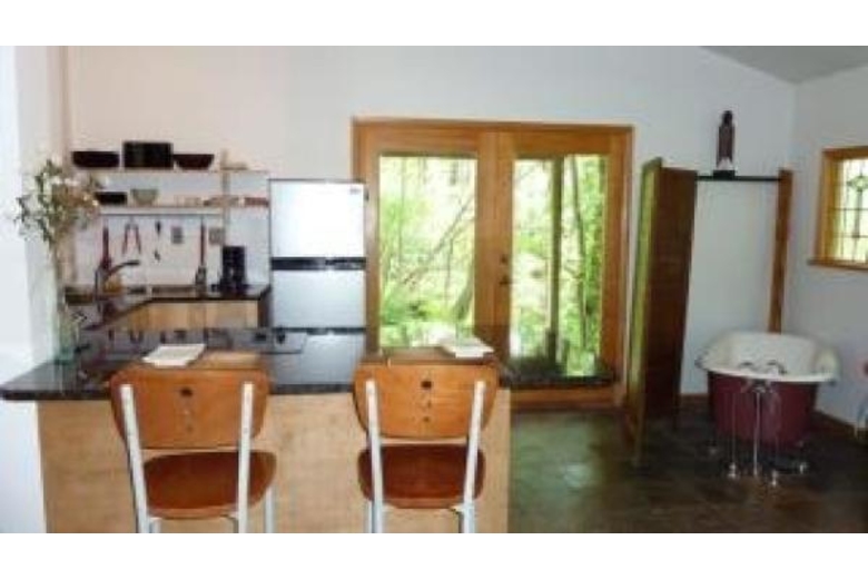 The Romantic Zen Cabin - Featured in both NY Magazine and The NY Times as the spot to go to when vacationing in Woodstock. Secluded, romantic, Japanese-styled designer's cabin is located on a private road, and surrounded by two small streams. This Non-Smoking house features panoramic views of the mountains and woods. House features beautiful Asian slate floors, cool slate shower and marble bathroom, romantic claw foot bathtub in the living room facing deck and stream.