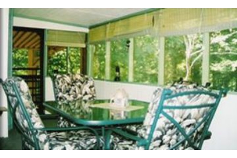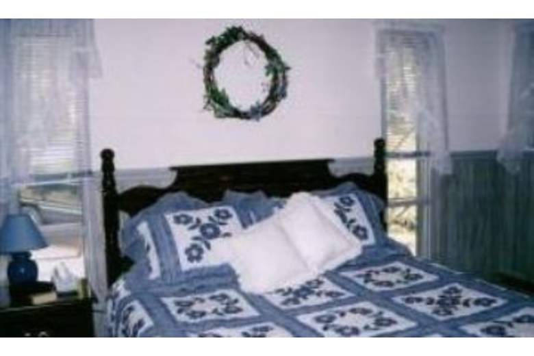 This cabin sleeps 6 with 2 bedrooms and 2 baths. Two bedrooms on opposite sides of the cabin offer their own bathrooms... with a trundle daybed in another part of the cabin converting to two twin beds or one king-size bed. Satellite television, vcr, dvd player, all linens, washer, dryer, iron, ironing board, a library stocked with books and games, as well as a charcoal grill and picnic table are provided for your use.Surrounding Description