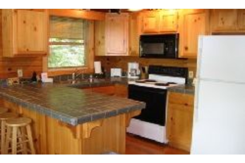 The Bears Den has a lot to offer with a main floor and a loft overhead. The main floor has a deck with a large inviting hot tub and the bedroom with a Queen sized bed, TV, and VCR. Just down the hallway is a large Living Room with a fireplace, sleeper sofa, TV, and DVD player. A full Kitchen joins the Living room, and there is a table with seating for eight. The main floor also has the bathroom. A set of stairs leads from the living room to the loft. The loft has a pool table and a futon.Surrounding Description