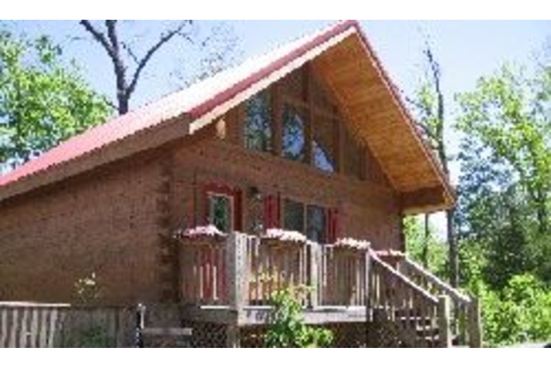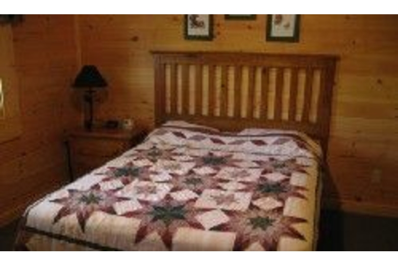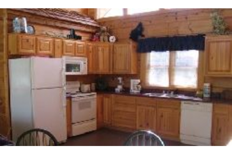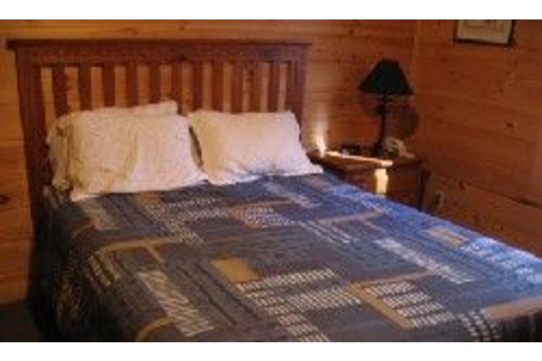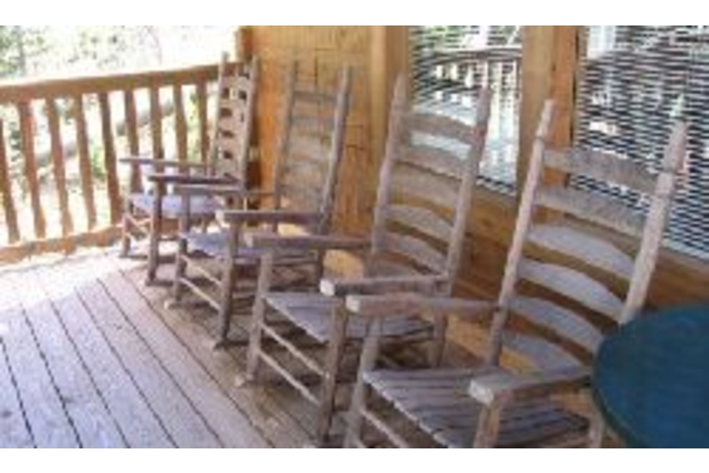 The entrance to the cabin is on the main floor. The front door opens onto a large Living Room with a fireplace, a DVD player, a VCR, and a TV. A full Kitchen joins the Living room, and there is a table with seating for four. The main floor deck has several rocking chairs to relax in. A set of stairs leads from the living room to the lower floor. The lower floor has two bedrooms and a bathroom. Each bedroom has a Queen sized bed and a TV.Surrounding Description