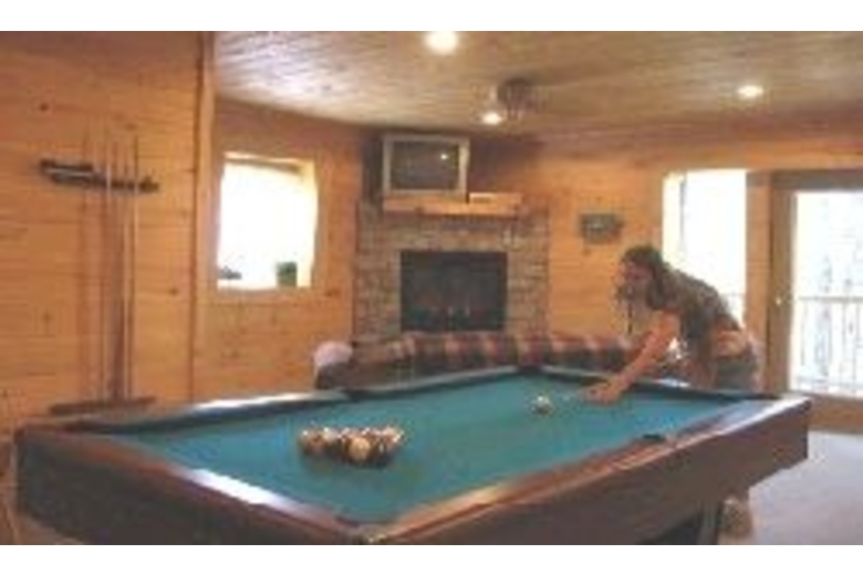 Blue Mountain View has a lot to offer. It has a main floor and a lower floor. Both floors have decks, and the lower floor deck has a hot tub. The entrance to the cabin is on the main floor. The front door opens onto a large room with a King sized bed, fireplace, jacuzzi, DVD player, VCR, TV, full Kitchen, and table with seating for four. A bathroom is off to one side. A set of stairs leads from the upper floor to the lower floor. The lower floor has a pool table, DVD, TV, VCR, washer, dryer, and another bathroom. A hot tub sits on the back deckSurrounding Description