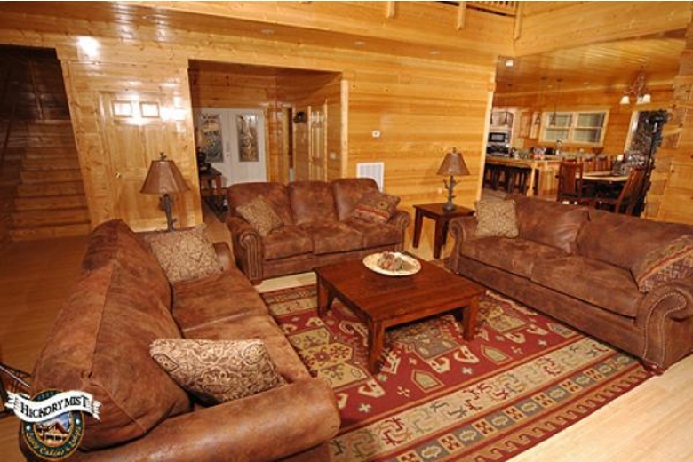 Just inside the wide entrance hallway of this Gatlinburg vacation cabin rental, the glass and beam walled main living area offers warmth from the gas log fireplace, comfort on three large distressed leather sofas, and entertainment on the 42†flat screen TV / DVD. Convenience abounds at Avery’s, including a huge utility room between the kitchen and entrance hallway. The Maytag washer and dryer are placed for the ultimate ease of caring for your guests.