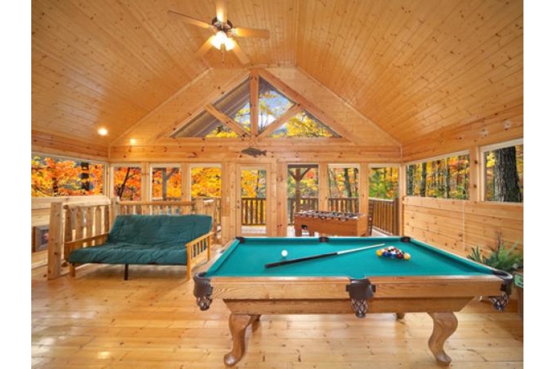 For your entertainment, our Gatlinburg log cabin rental features three TVs with VCR and DVD players to catch up with your favorite movies, shows and sitcoms. You can keep a tab on your emails and official commitments as we have wireless Internet access. There are pool and foosball tables to gather over friendly games. The private furnished patio and deck are just perfect for retiring over your favorite brews and beverages. We are close to the Gatlinburg Community Center featuring an indoor swimming pool, bowling alley, basketball courts and a superb fitness center.