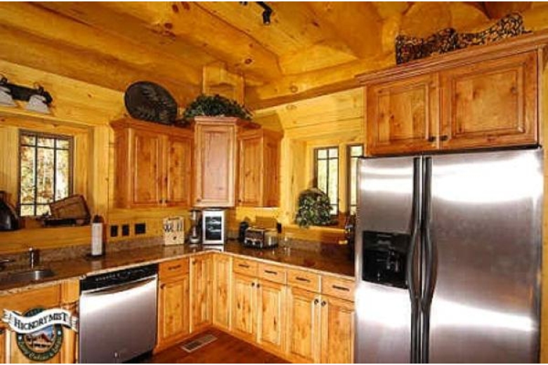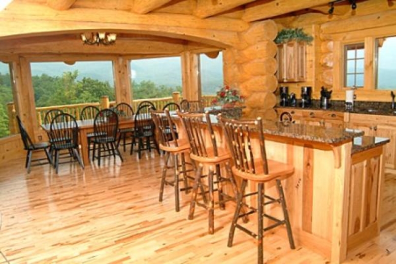 This 6 bedroom rental cabin in Pigeon Forge has adequate sleeping arrangements for 26 vacationers and features king, queen-sized beds and an array of sofa sleepers. Each bedroom is a master suite with classic oak and leather beds and flat screen HDTV with DVD player. The main master bath has a large double sink vanity and stone tile multi-head massage shower with a large whirlpool tub.