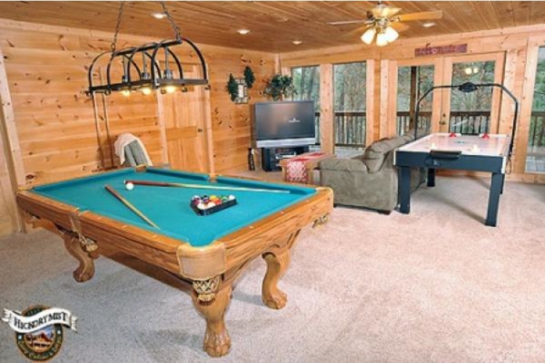 Each bedroom at this 7 bedroom rental cabin in Pigeon Forge is a master suite with rustic log beds and plenty of privacy for 22 guests. All the bedrooms are equipped with a TV and DVD player. The luxurious cabin offers every amenity you could ever need, with leather furniture in the living area and a stack stone fireplace for those cool evenings to make you feel like the king of your own castle. There are games such as Arcade Legends, Double Player Crusin Exotica, foosball, air hockey and pool table in the game room, which is also a perfect place for watching your favorite movies on 42†TV with a DVD and VCR.