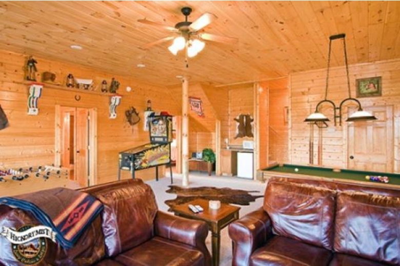 Equipped with a custom-built king size log bed, bunk beds and queen size sofa sleepers, this 8 bedroom rental cabin in Pigeon Forge can comfortably lodge up to 36 guests. All the four bathrooms are well appointed with modern amenities featuring Jacuzzi bathtubs in two of them. For those who prefer cooking their own meals during vacations, there is a fully equipped kitchen at our Pigeon Forge, TN cabin rental.