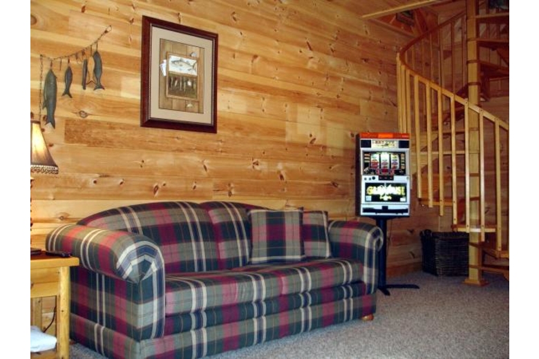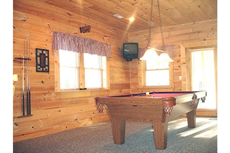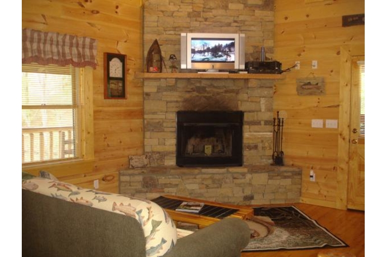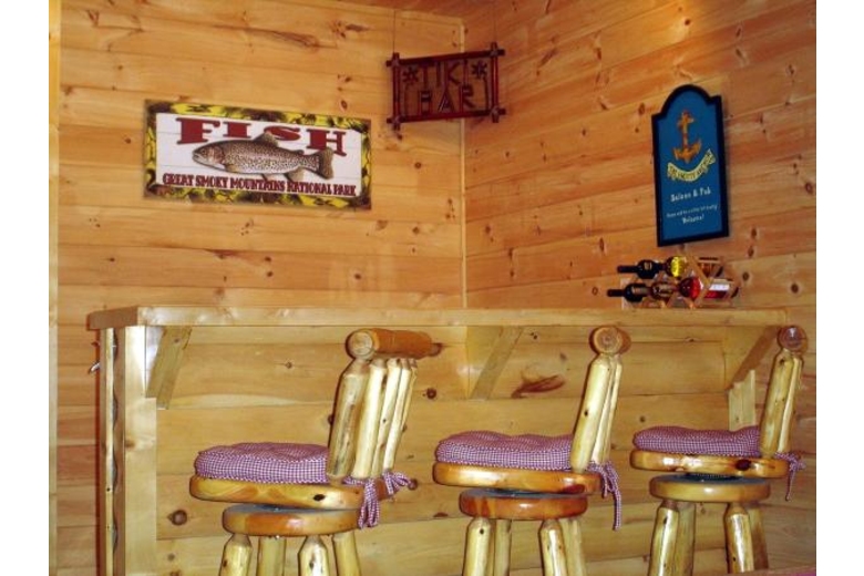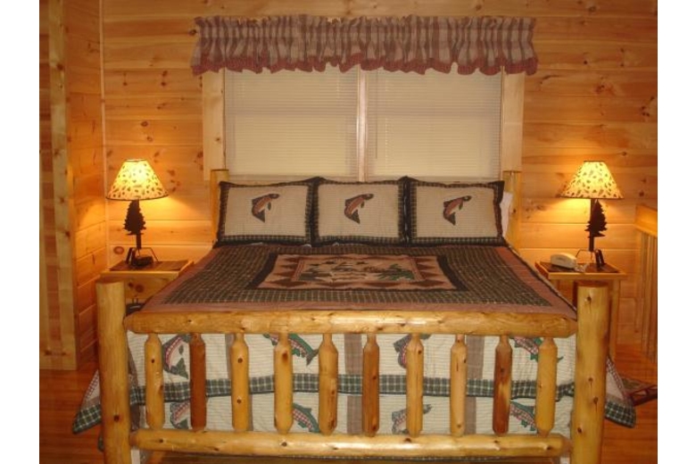 Nestled amid breathtaking mountains and close to amazing outdoors, The Fishing Hole, a Pigeon Forge, TN vacation rental, offers an ideal base for a honeymoon or a romantic getaway. Here, you can take in panoramic views of the lush landscape and recharge and rejuvenate amid great outdoors. This professionally decorated 1 bedroom cabin rental in Pigeon Forge can lodge up to four guests. The plush bedroom includes a king-size log bed and an elegant en-suite bathroom. For extra guests, you can use our queen-size sofa sleeper available in the game room. This cabin has an additional half bathroom as well. The kitchen is fully equipped and superb barbecuing provisions are also available to pamper your taste buds. Our child friendly Pigeon Forge vacation rental cabin features a well appointed living room with a fireplace, plasma HDTV, satellite TV, VCR and stereo. With our wireless Internet access, you can surf, chat, email etc. The game room has a pool table and some interesting board games. The huge mountain view deck comes with a private hot tub so that you can relax whenever feel played out. Just steps from our cabin is a community summer swimming pool where you can enjoy a refreshing dip. If you like to go on vacations with your pets then this Pigeon Forge pet friendly cabin is well suited to your requirements. Ski lift, hiking trails, mountain biking areas, sightseeing, and all that this area has to offer are easily accessible from our Pigeon Forge cabin rental. You can also fish right off the deck, enjoy miniature golf, indulge in numerous adventures and outdoor sports and activities like hiking, rock climbing, mountain biking and much more while staying at this Pigeon Forge vacation cabin.