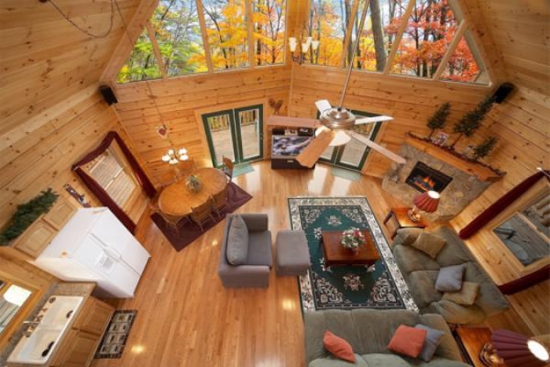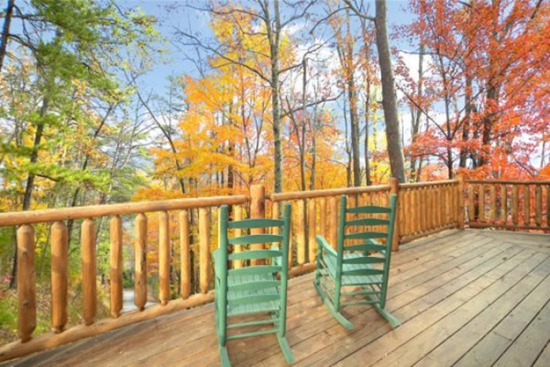 The designer furnished living room of this Pigeon Forge natural vacation cabin rental, Tennessee has vaulted ceilings, fireplace and is disability accessible. It includes facilities such as a 50" HDTV/DVR/surround sound system, satellite TV, DVD player and VCR. There is a game room too, where you can enjoy pool, air hockey, foos ball, dart board and video games. The kitchen is fully equipped to cater to your culinary needs. There are auperb provisions for barbequing as well. There are huge decks with premium patio furniture, log rockers and a porch swing.