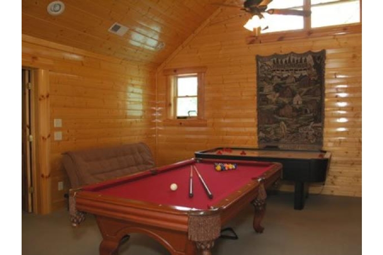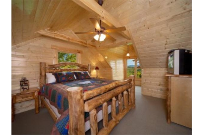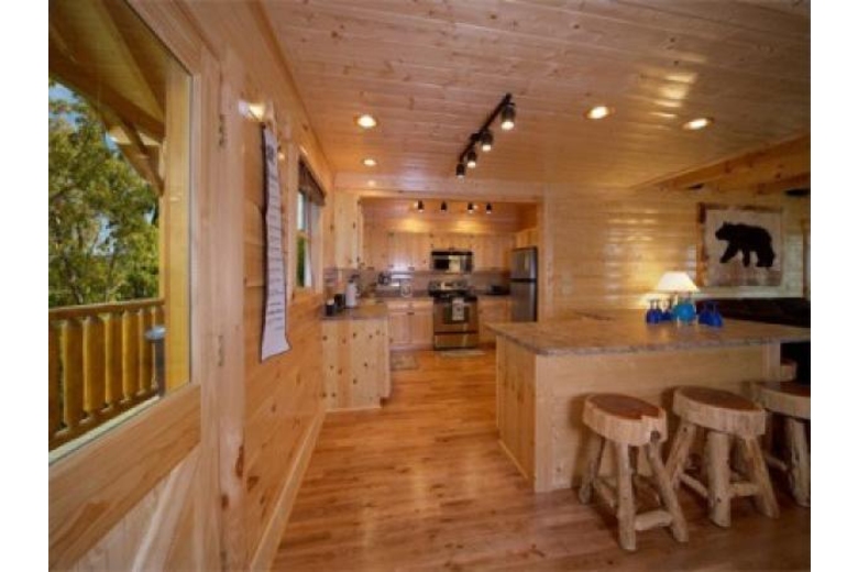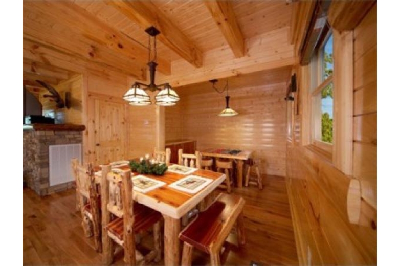 With exquisite furnishings, vaulted ceilings, and fine log wood decorations, the living room of this Pigeon Forge vacation cabin becomes a relaxing and pleasing place. It includes facilities such as big screen TV, TV, DVD Player and VCR for your indoor entertainment. To cater to your culinary desires, there is a fully equipped kitchen as well. The kids will enjoy hand-crafted log dining table designed especially for them.