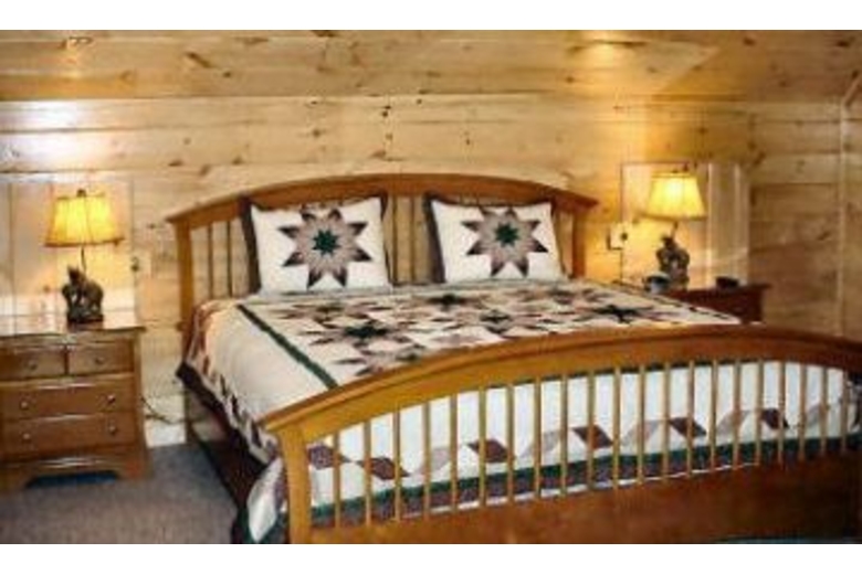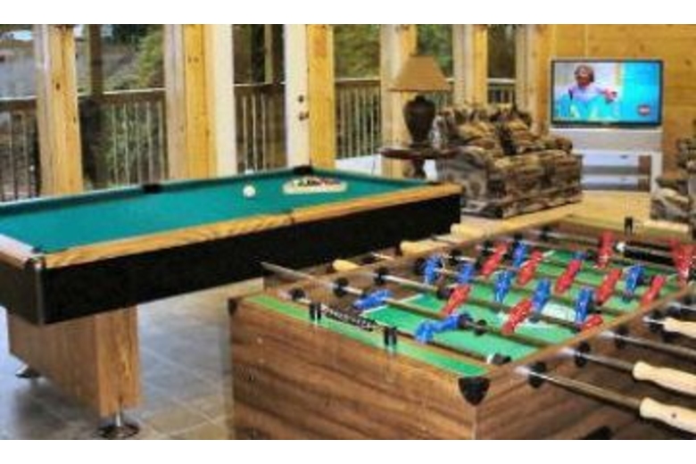 In this cabin you will find five bedrooms, five and a half baths, four king beds, queen bed, two double sofa sleepers, gas fireplace, seven TVs, two DVDs, satellite TV, Jacuzzi, hot tub, gas grill, pool table, foosball, washer and dryer.Surrounding Description