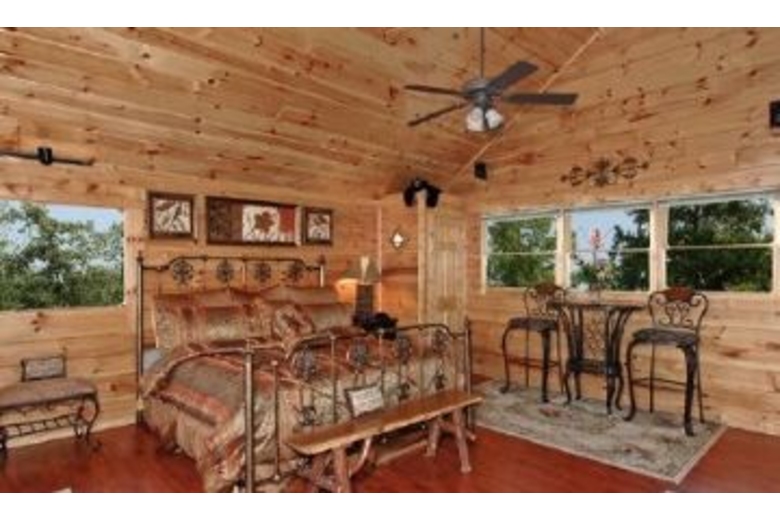 This cabin features a two person heart shaped jacuzzi tub, a heated towel rack, sunset views, wide screen television, a fireplace, outdoor hot tub, a heart shaped waffle maker, homemade ice-cream maker, and a business center. Rock away on the porch or enjoy the sunset in the gazebo; this will be a vacation to remember.Surrounding Description