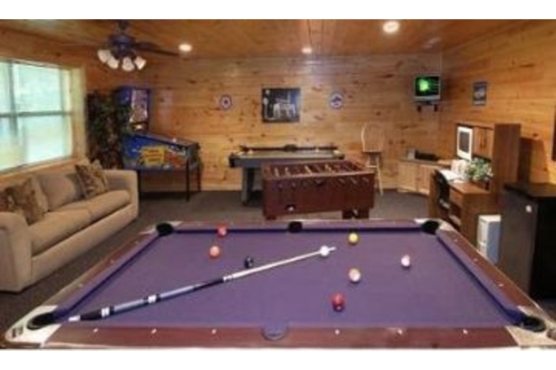 Dogwood Lookout has easy access to the entry of the cabin and there are no steps as you walk in the front door. The cabin welcomes you with cathedral ceilings in the gourmet kitchen and living room as you enter and view the serenity of this retreat through the large open windows that surround the upper level. The kitchen comes fully equipped if you prefer to cook indoors. But if you are looking to fully enjoy the nature around you throw those steaks on either of the two charcoal grills located just outside the cabin. The master bedroom and adjoining master bath are also located on the main level where you can relax in the Jacuzzi tub. The main level also offers a large covered deck with country rocking chairs and a swing so you can enjoy watching the abundant wildlife from your private deck. Dogwood Lookout also has a gas fireplace in the living room to enjoy while watching a movie or sports events on the big screen T.V. The second level has 3 more bedrooms with king beds and a full bathroom. There is a second covered deck on the middle level that has a 4 person hot tub for you complete relaxation. The third level offers all the entertainment you need with a wide variety of games to choose from. Dogwood Lookout offers a pool table, foosball table, air hockey, and an X-Box with 10 new video games! The recently installed computer with high speed internet allows you to stay in touch with the world while enjoying your peaceful cabin a top of the Smokies.Surrounding Description