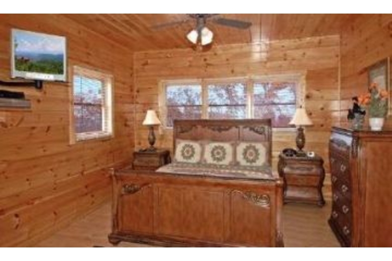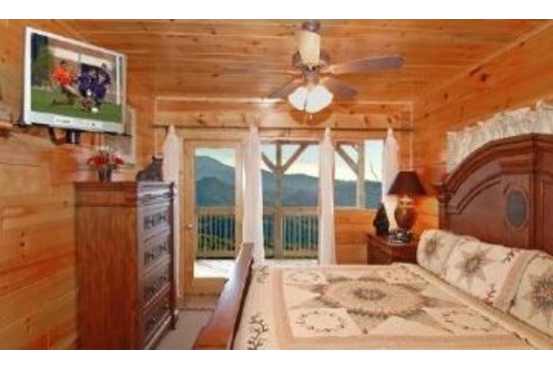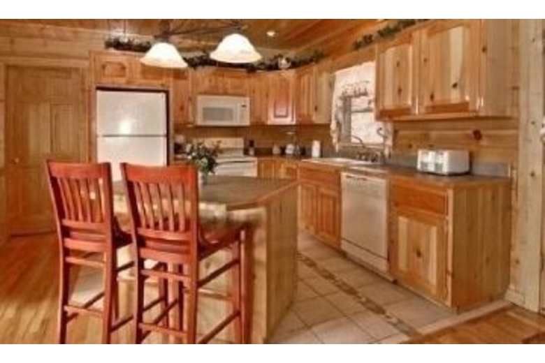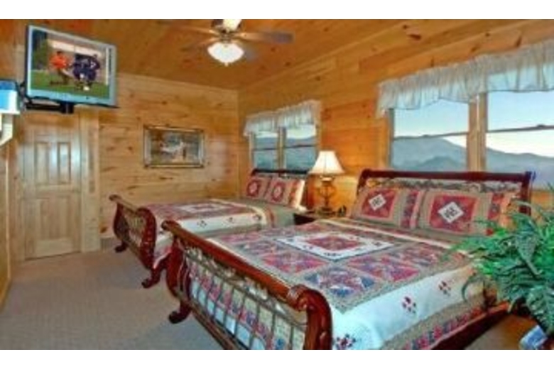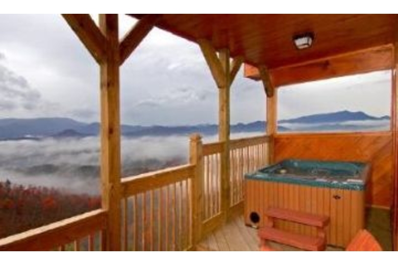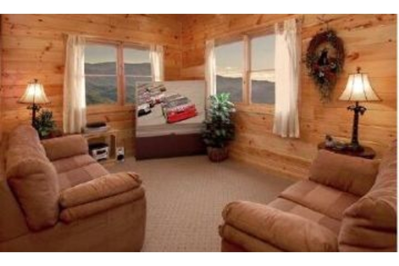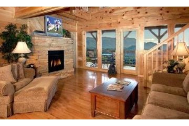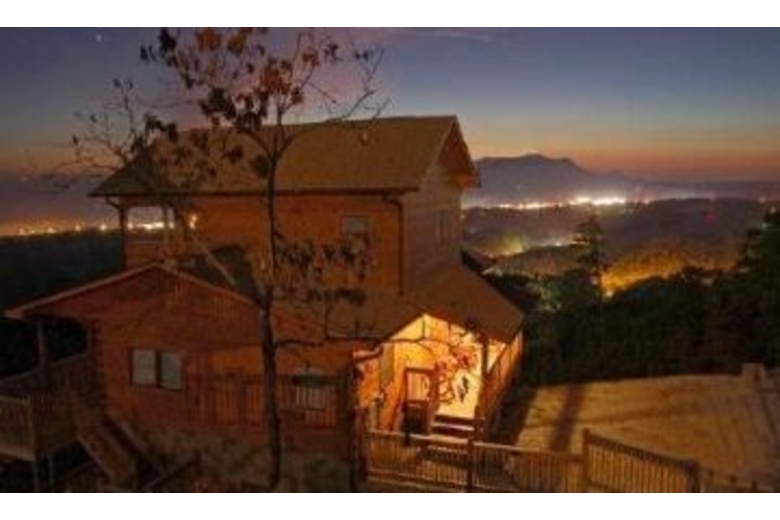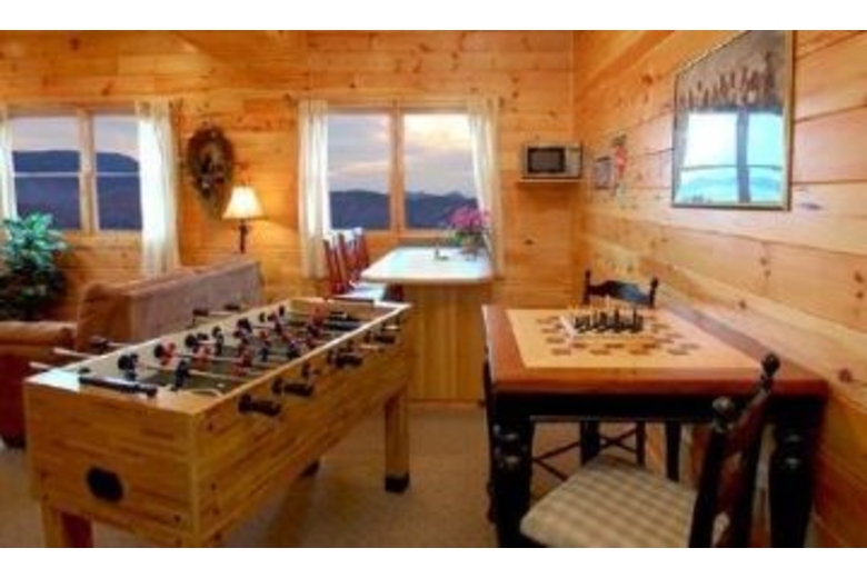 As you enter the main level of Lookout Lodge, you find a large living area with sofa and chase facing a stone fireplace and TV/VCR/DVD. There is a fully equipped kitchen and dining area. Relax and enjoy the gorgeous view through the large glass windows. Off each side of the living area is a master bedroom suite with king size bed, TV/VCR/DVD and master bath with two-person Jacuzzi. One master suite also has a second fireplace. Downstairs you find a huge family game room with pool table, air hockey and foosball. Continue through the game room and relax on the sofa and love seat in the theater area. Watch your favorite movie on a 62'' big screen TV/VCR/DVD. A wet bar is provided with fridge and microwave to enhance your movie viewing experience. Also on this level is a third bedroom with two queen beds, TV/VCR/DVD, and full bath with shower/tub. Upstairs, on the third (top) level, the entire area is a fourth bedroom with king size bed; chase in the reading area, and full bath. Enjoy the awesome view through the large glass windows or step out onto the private deck and relax in the bubbling four person hot tub where you can get a ''top of the world'' view. Relax on any of the three decks in captain's chairs or lounge chairs. There are deck tables if you choose to eat on deck, or even a swing to enjoy the awesome mountains, a spectacular sunset, or the night lights of Pigeon Forge. In addition to the amenities already mentioned, this luxurious four-bedroom, four and a half-bath log cabin retreat has washer/dryer, grill, and swimming pool access in season.Surrounding Description