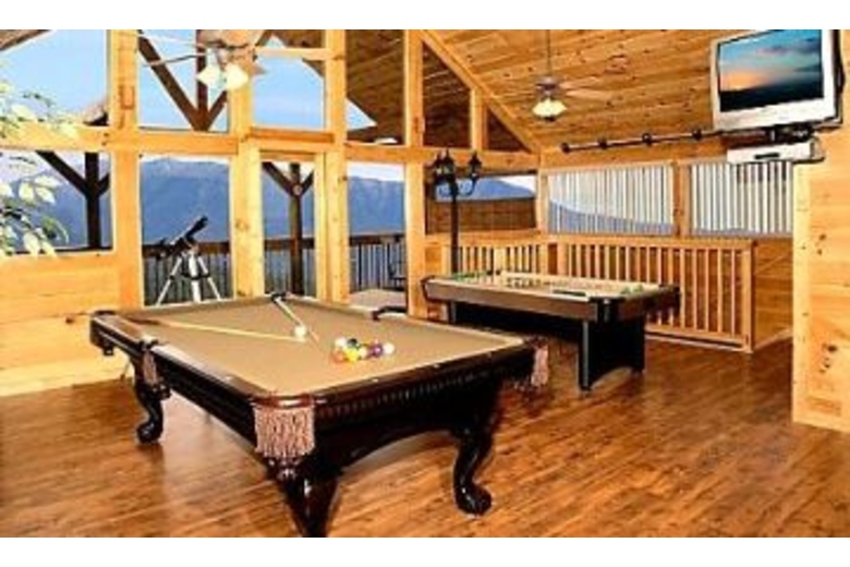 Welcome To Rocky Top Retreat! Rocky Top Retreat is a new 2 story, 1 bedroom, 2 full bath cabin that sleeps 6 with all the amenities including loft game room with king bed. Step into this cozy cabin with intentions of pure relaxation or maybe catch up some emails and surf the web while taking in the spectacular views of the mountains via free wi-fi access. Enjoy the views or kick back and watch a movie via a 42'' plasma TV complete with surround sound. Just want piece and quiet? Cuddle on the couch and take in the warmth of the stacked stone fireplace. To bring out the competitive side in the family, challenge them to a game of 8-ball on competition style pool table or maybe a fast and furious game of air hockey. Retire to the privacy of your room with cable TV or watch a movie. With 3 TV's and 3 DVD/VHS players you will be sure to find the channel or movie you want to watch. Try relaxing either inside with spectacular views of the mountains in your private, jetted tub or get outside and enjoy a panoramic view of the mountains while relaxing in the hot tub. Rocky Top Retreat has a full gourmet kitchen fully stocked with all appliances and kitchen gadgets to satisfy any chef!Surrounding Description