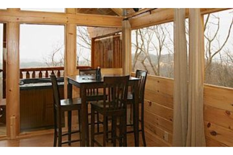 We hope you have a magnificent vacation with all the comforts of home at Tree Top Haven. Start your vacation with a breathtaking view that spans 30 miles of the Cumberland Mountain range. You can see Pigeon Forge and Sevierville from both decks. A view that will keep you coming back time and time again. We have plenty of rocking chairs, an eating area, a charcoal grill, and a hot tub with surround sound all for your outside pleasures. To add to the view, you can even hear the whistle of Dollywood's coal-powered train from down below; after all, we are just above Dollywood and Splash Country. Come inside and you will enjoy all first-class furnishings and amenities that will ensure a memorable stay. Tree Top Haven offers 2 king beds with top-quality pillow top mattresses ensuring a great night's sleep. A queen sleeper is also plumped up with an upgraded mattress. Our kitchen is a gourmet style kitchen which features granite countertops along with a fully stocked arsenal for the one who loves to cook in the mountains. Step into the den to find a 52" big screen tv packaged with digital cable, dvd player, and surround sound. We also provide high-speed internet access for anyone who brings their laptop. The loft is also loaded with a pool table, a video arcade game which features five of the most played games of the 80's, a 32" flat screen tv with digital cable, dvd player, and surround sound. The loft also has a king bed, stone fireplace, and a full bath with a jacuzzi tub. Board games are also provided for those nights that you just don't want to get out. Have a great time!Surrounding Description
