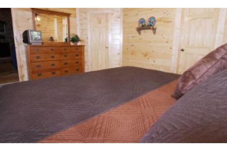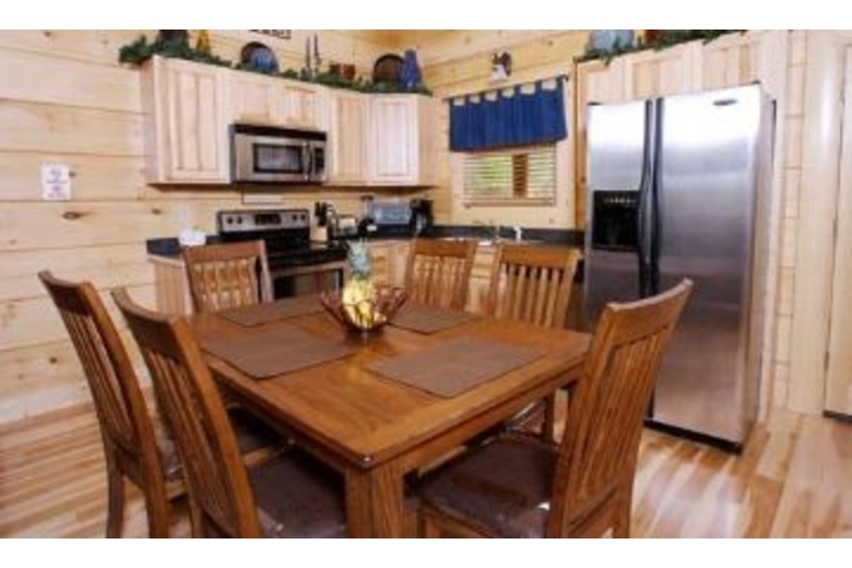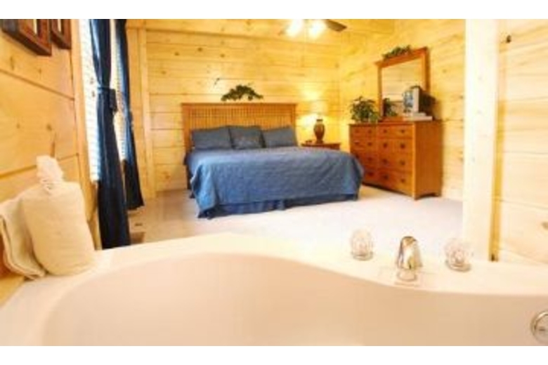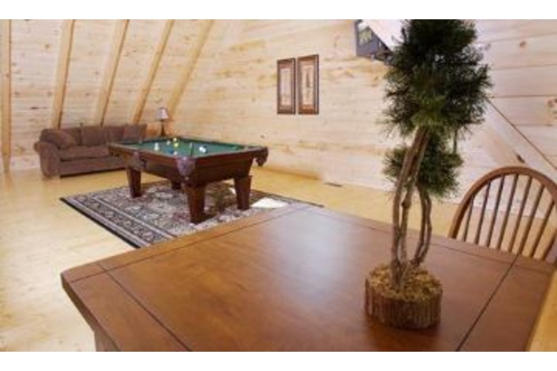 Nurture yourself with amenities such as the hot tub, fireplace, pool table or bedside Jacuzzi. With a king bed in each bedroom, and two queen sofa sleepers, this cabin can accommodate up to eight people. There is a nicely equipped kitchen, stone fireplace in the living room, and outside you will find some country porch rockers perfect for relaxing and enjoying the view.Surrounding Description