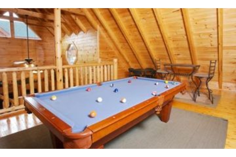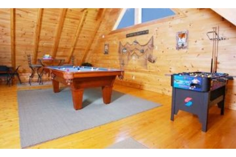 The whimsical touches are balanced by rich hardwood floors, black appliances and a striking stone fireplace. The cathedral ceiling imparts an open and airy feeling throughout. Both bedrooms feature TVs and private baths, and with two sleeper sofas it will sleep eight guests. The whole family can kick back in front of the 42" plasma High Definition TV with surround sound system. Add in the pool table, foosball, VCR, DVD and CD player, and you're set for in-house entertainment.Surrounding Description