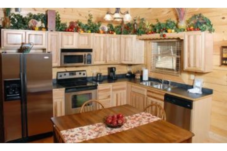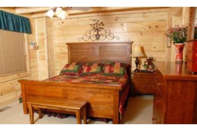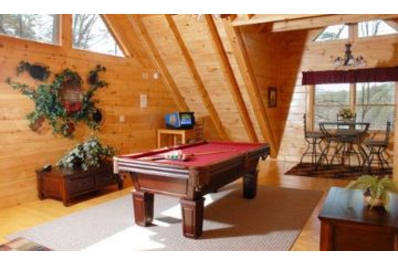 This wonderful log home has two bedrooms, each with a king size bed. The master bedroom also has a great bedside jacuzzi. There is a stone fireplace in the great room, and the kitchen is fully equipped. Upstairs in the loft you will find a pool table. There is a private hot tub on the deck, as well as some country porch rockers.Surrounding Description