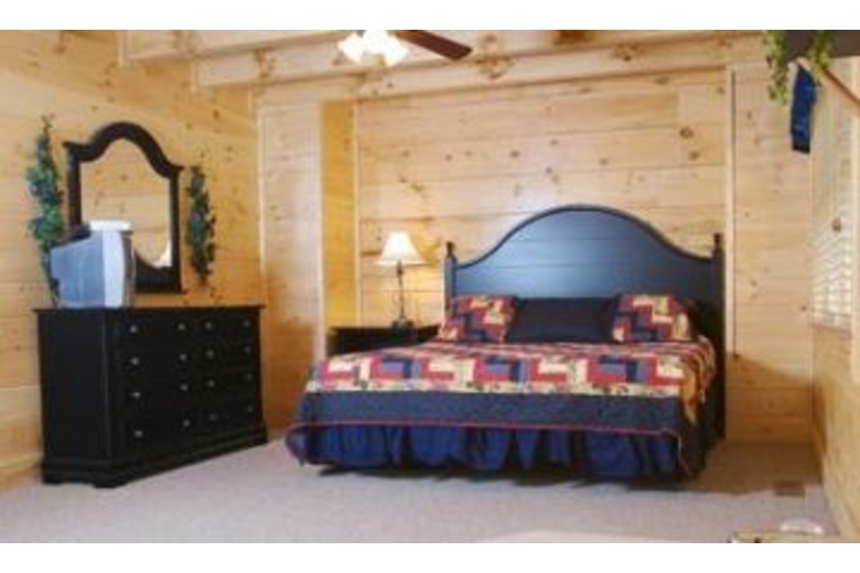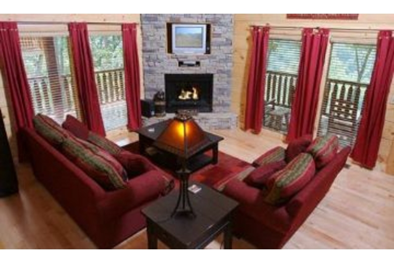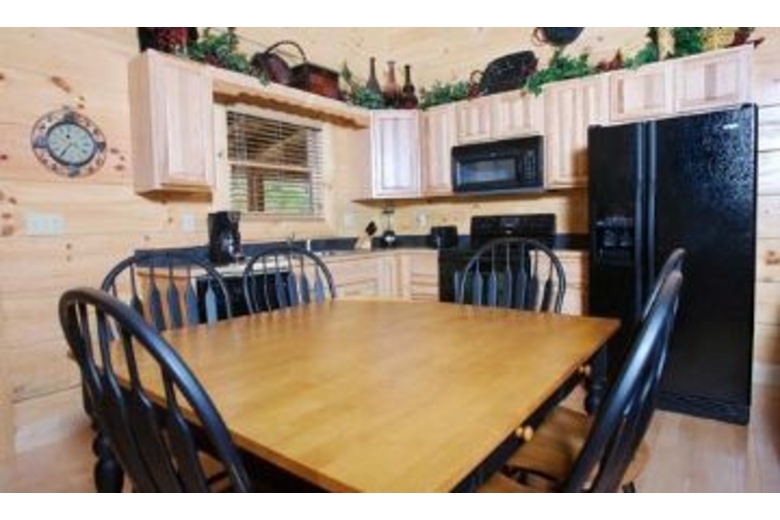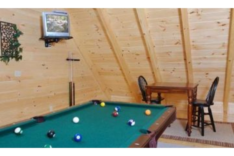 This wonderful log home has two bedrooms, each with a king size bed. The master bedroom also has a great bedside jacuzzi. There is a stone fireplace in the great room, and the kitchen is fully equipped. Upstairs in the loft you will find a pool table and a queen sleeper sofa. There is a private hot tub on the deck, as well as some country porch rockers and a porch swing.Surrounding Description