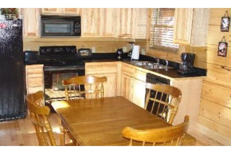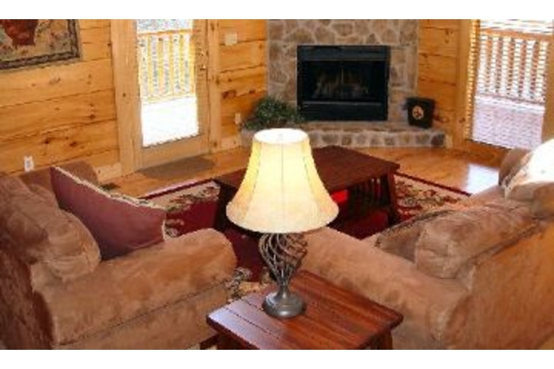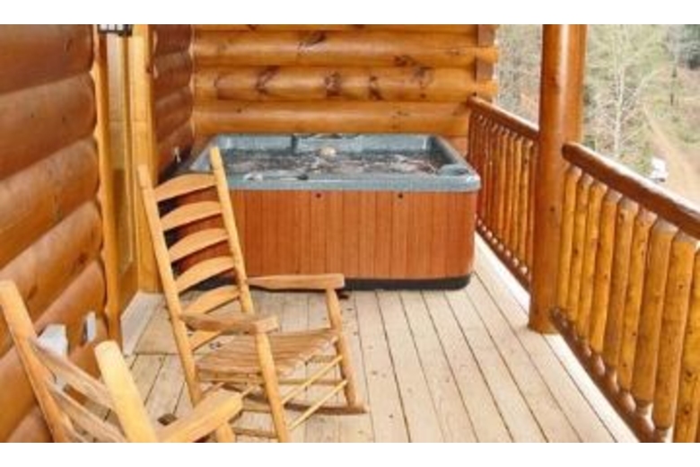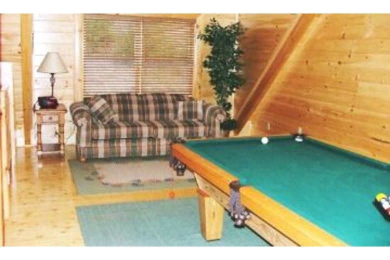 This wonderful log home has two bedrooms, each with a king size bed. There is a stone fireplace in the great room, and the kitchen is fully equipped. Upstairs in the loft you will find a pool table and a queen sleeper sofa. There is a private hot tub on the deck, as well as some country porch rockers.Surrounding Description
