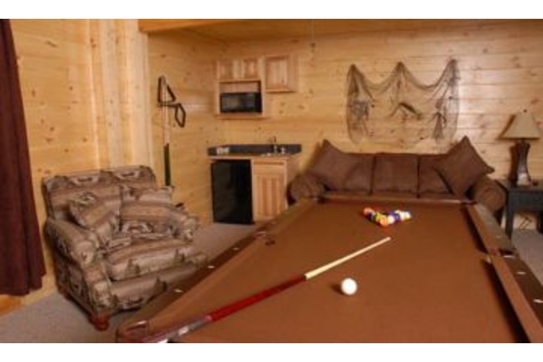 The cabin sleeps 12 and there's plenty of room for all. Whether you're gathered in the spacious great room or in the recreation room with its pool table, fireplace and wet bar, good times are sure to follow. Slip upstairs to the private master suite to find an oasis for two with an airy vaulted ceiling, fireplace and bedside Jacuzzi.Surrounding Description