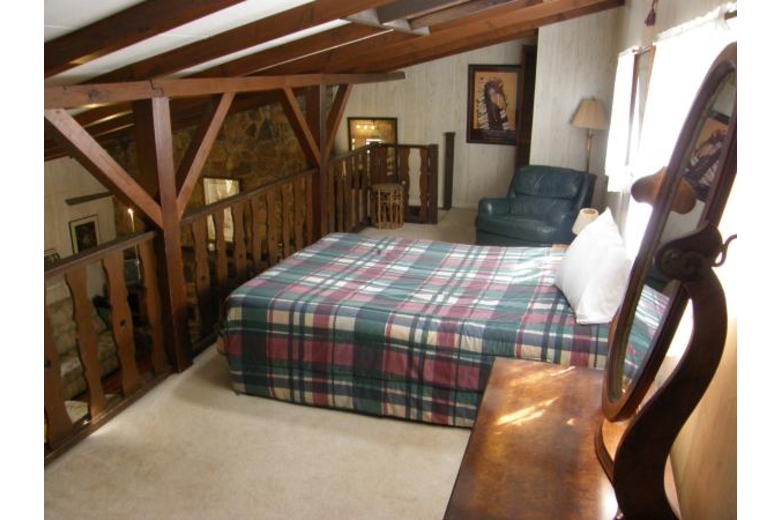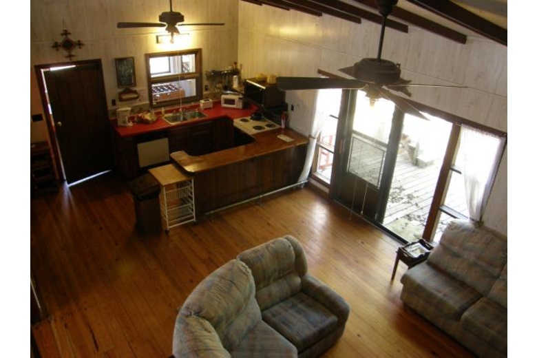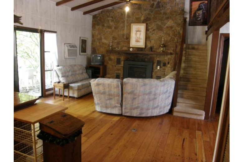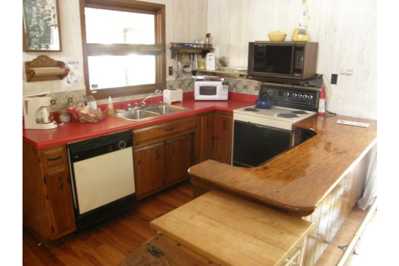 A door opens into the beautiful main living area with a vaulted ceiling and a romantic natural-stone gas-log fireplace, color TV with 100 channel cable reception, and additional furniture along with your fully-equipped kitchen with a 4-eye electric range with oven, microwave, automatic dishwasher, toaster, electric can opener, 'drip' coffee maker, full-size refrigerator / freezer and a kitchen table 4 chairs, bar counter (Additional dining available in the game room with a large picnic table)