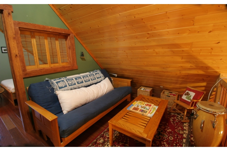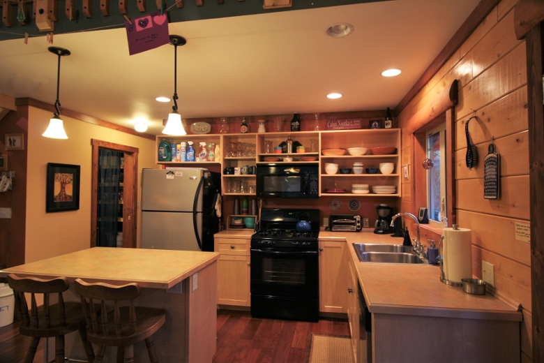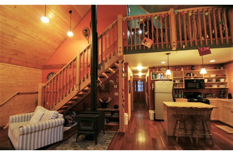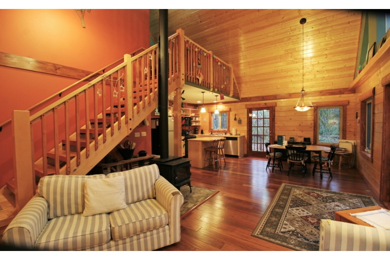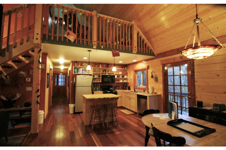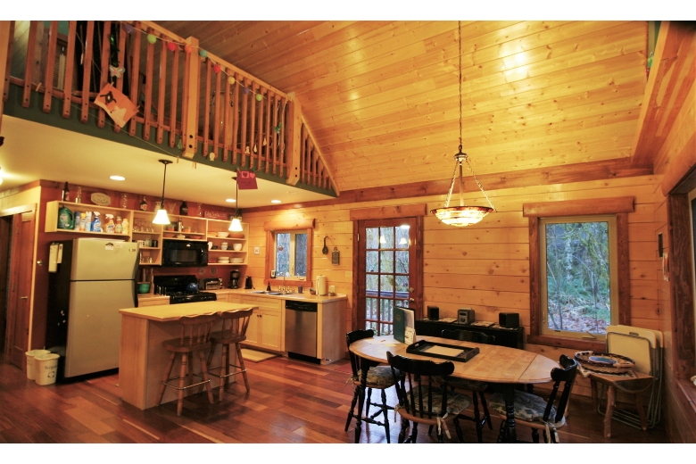 Your family will have a delightful time in this 2-story, 3-bedroom, 2-bath log cabin with a natural pine interior. The first floor features a large, open and airy, kitchen/dining/living area with vaulted ceilings, complimented by a wood stove, (firewood provided) and a breakfast bar. There is one bedroom with one queen bed, a second bedroom with one set of bunks, and one full bath augmented by a laundry cubby with a full-size washer/dryer. The second floor features a loft sitting area, a master bedroom with one queen sized bed and an adjoining full bath. Exterior features include a wrap-around deck with a gas grill, and an enclosed summer porch for spending lazy afternoons.