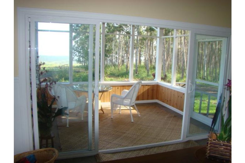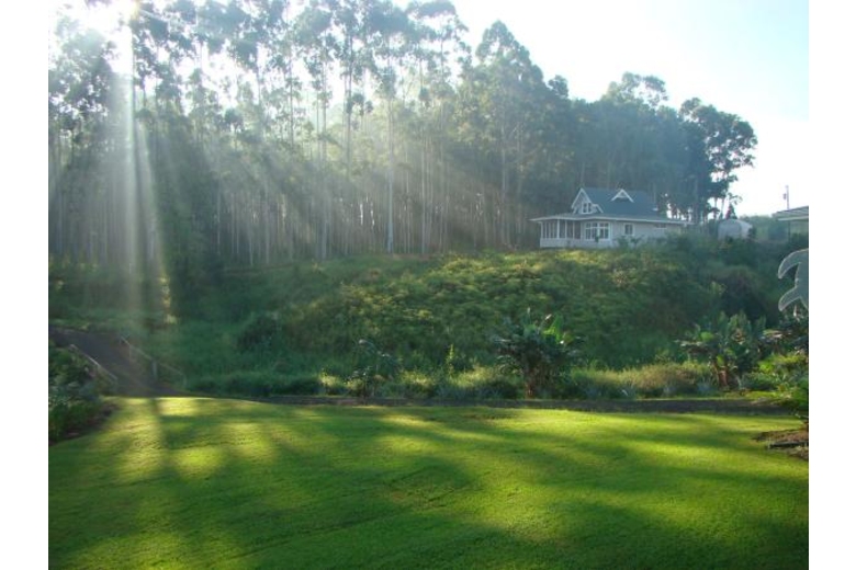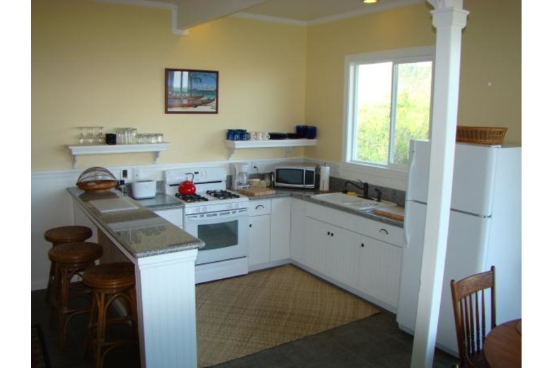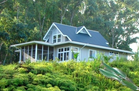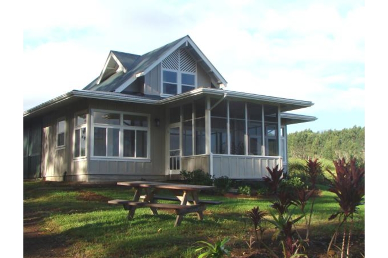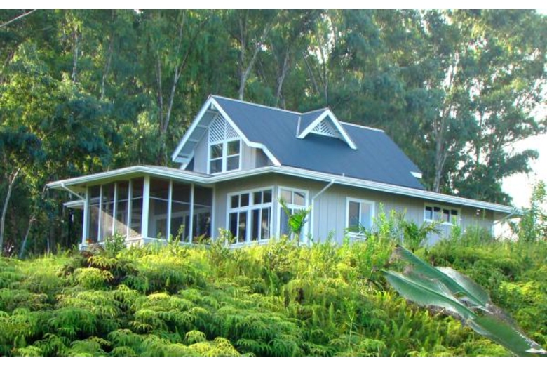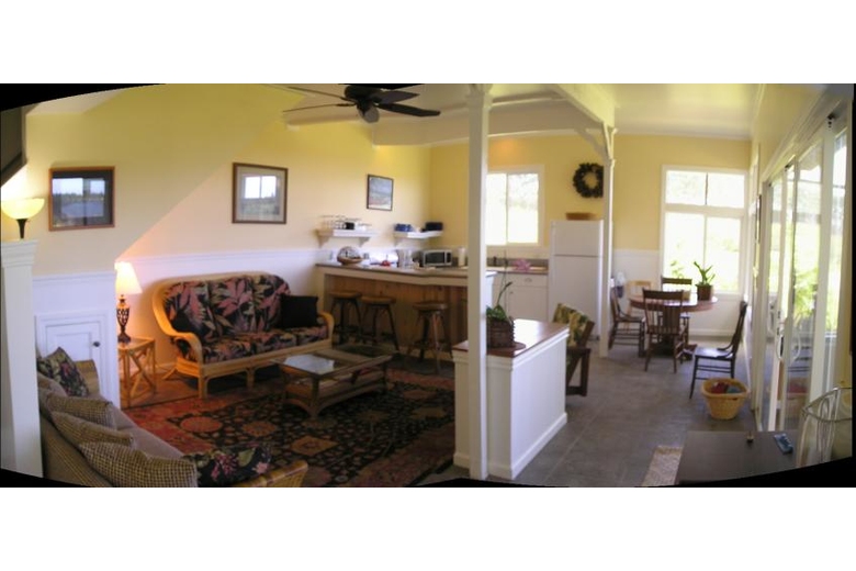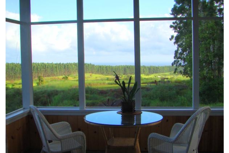 Kapehu Cottage is situated on a twenty acre plantation property with a waterfall, fruit orchard, garden and twelve acres of woods. Our Pepeekeo vacation rental cottage is situated on it's own site and offers an outstanding ocean view as well as a view of the 14,000 foot peak of Mauna Kea. The cottage is newly built in a craftsman style, located in a peaceful, private and natural setting. The furnishings are Hawaiian style, very casual and comfortable. Accommodations for up to four guests with a private upstairs bedroom with a half bath and sitting area. The lower level is an open floor plan with living, dining and kitchen. One of two couches is a queen sleeper. We also offer a queen inflatable bed which can occupy it's own space in the reading nook. The lower level full bath features a glass block shower and is private from both living areas. Adjacent to the living area is a screened, furnished lanai. There is a full size and equipped kitchen with granite counters and an eating bar.