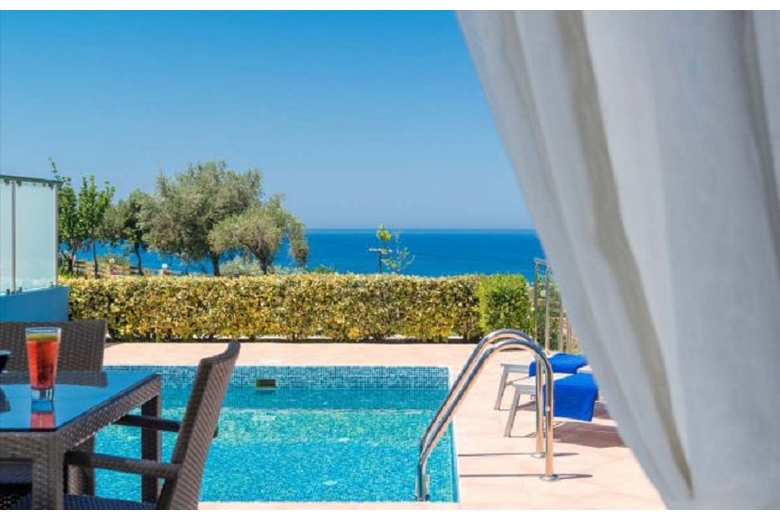 Very beautiful view of sea, mountains, swimming pool, garden, nature, trees.