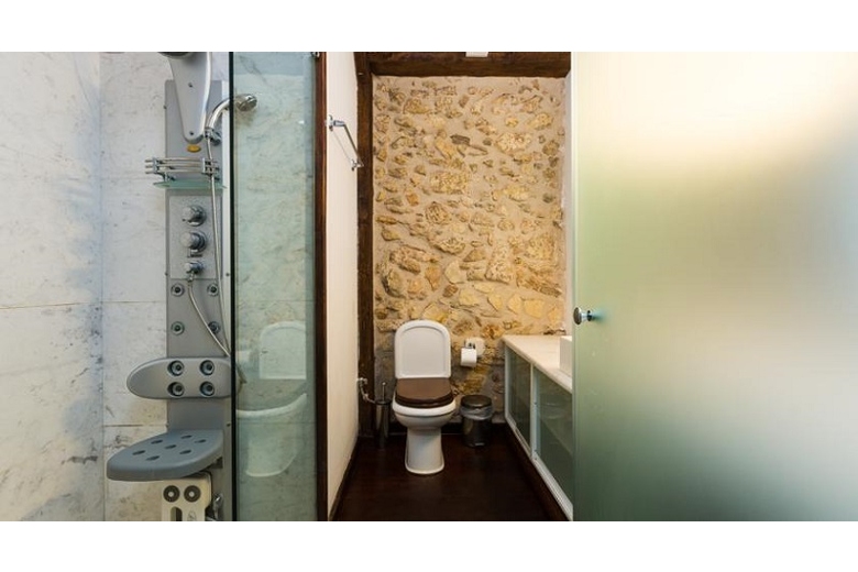 Main floor: Open large living room, with (curtain), TV flat screen electric heating air conditioning, veranda. 1 double bedroom, with (curtain), 1 double beds, air conditioning. 1 large room, with (curtain), 2 beds, air conditioning, exit from this room to the balcony. Kitchen: With large kitchen oven 4 ceramic glass hob hotplates microwave freezer dining table refrigerator. Bathroom: 1 bath/shower/WC. Upper floor: 1 double bedroom, with (curtain), 1 double beds, air conditioning, exit from this room to the balcony
