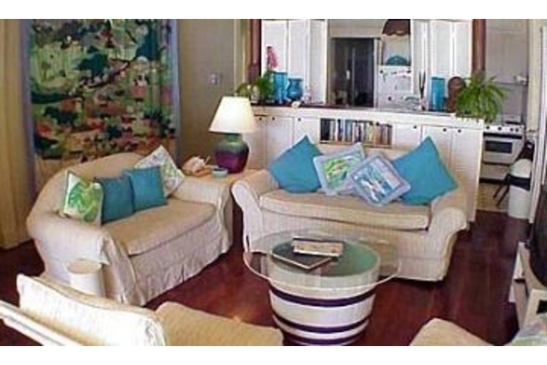 Whitecaps is an airy beach house located on Mullins Bay, a magnificent sweep of white sand and bordered by the calm, turquoise Caribbean Sea. Decorated with informal furnishings and local island art, the combined living/dining room looks out over the sea.