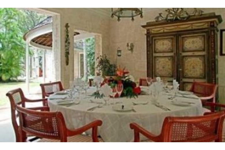 Built on one level, the interiors feature high ceilings and are comfortably furnished with upholstered English sofas and chairs with mahogany antiques and stylish tropical rattan set on sisal rugs. A grand living room opens on several sides through stately columns to beautifully furnished terraces and the gardens. The dining room is located in a separate pavilion and offers a round table that seats twelve and doors that open to the lush gardens on both sides.Surrounding Description
