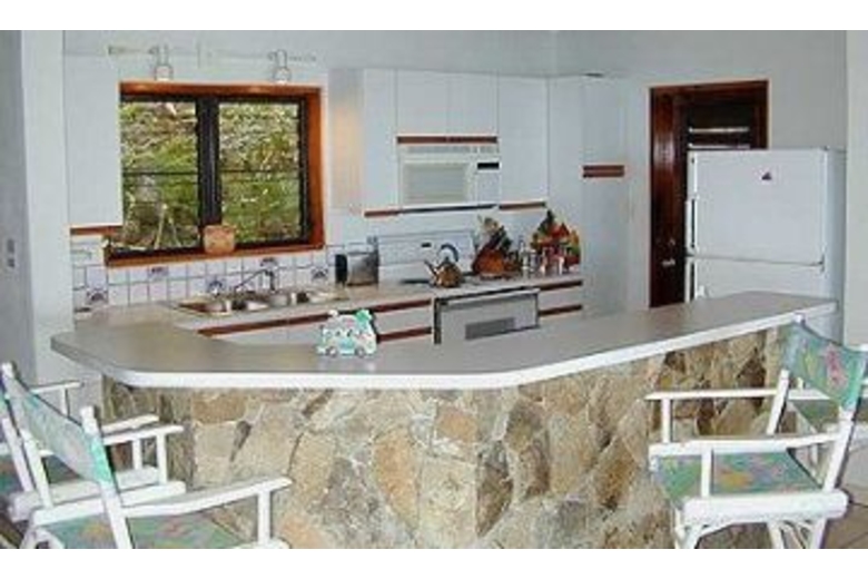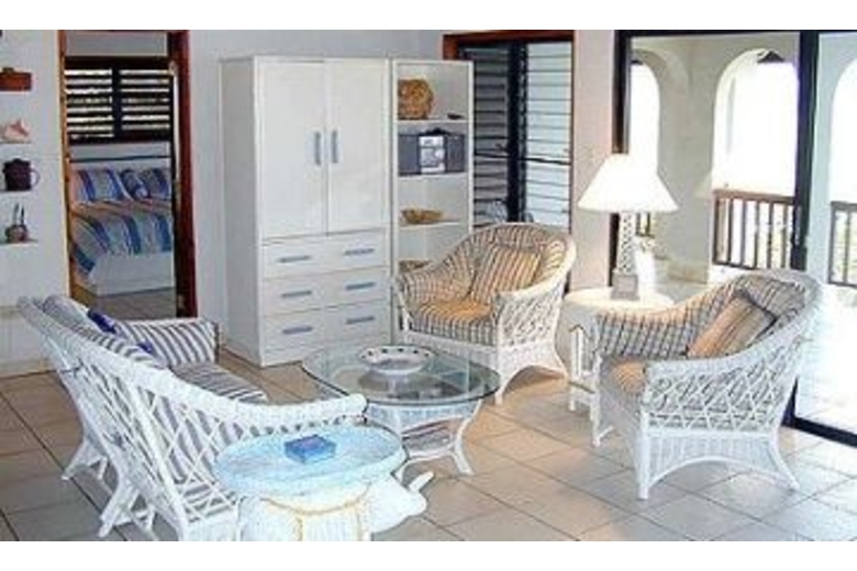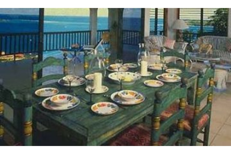 The interiors feature tropical white wicker furnishings accented with Caribbean colors of sand and sea. The villa is built on two levels. The main level features the spacious beamed living/dining and kitchen areasSurrounding Description