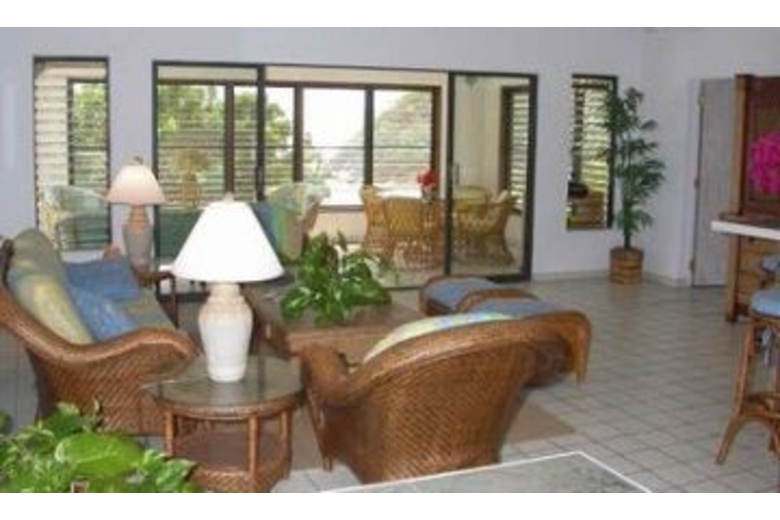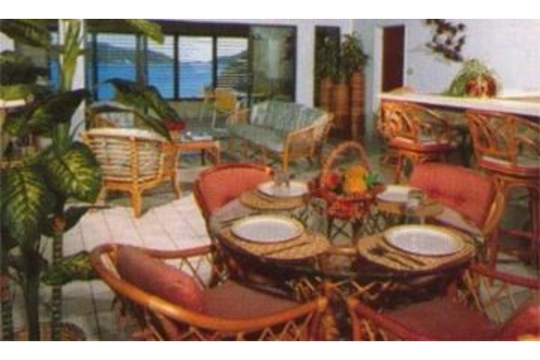 The villa is designed in two separate wings. The interiors feature high vaulted ceilings and is furnished in wicker and pastel hues. A spacious Great room consists of the living/ding area and kitchen. A wall of sliding glass doors lead from the Great Room to the enclosed covered porch, providing spectacular panoramic views and additional sitting and dining areas.Surrounding Description