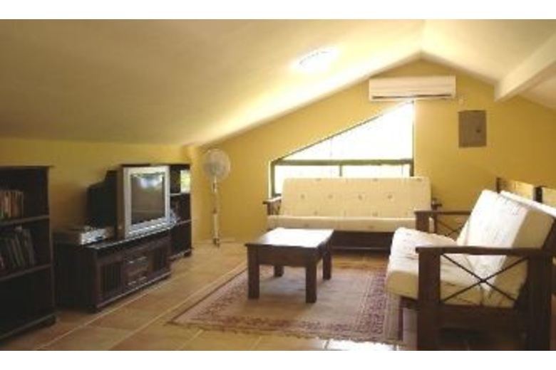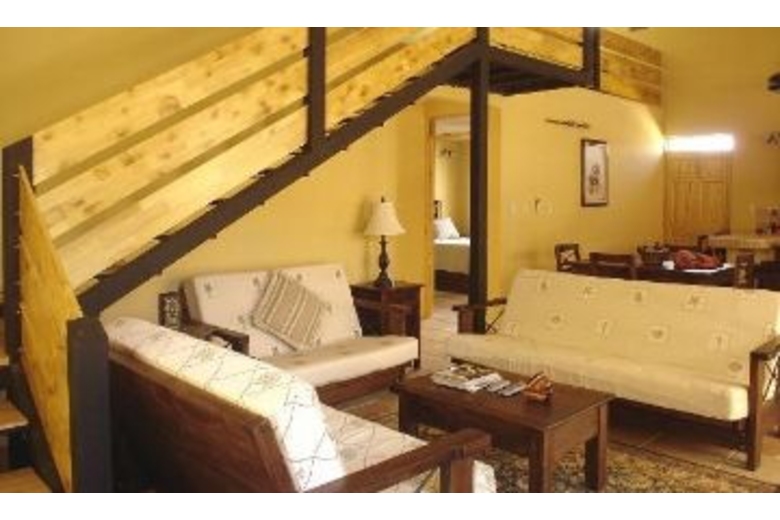 Downstairs, two bedrooms have a queen bed in each and individual AC units. The main living area downstairs has DirecTV, DVD and a 6 unit CD player stereo. The kitchen is fully equipped and has a breakfast bar and a table for four. Upstairs the loft is designed to be used as an entertainment area for kids or adults alike, as well as sleeping quarters for the younger crowd. The loft and stair rails are high and solid. On one side, there are comfortable lounges, a TV/DVD, as well as books and family games. On the other, there are four foam mattresses that can be laid down on the floor.Surrounding Description
