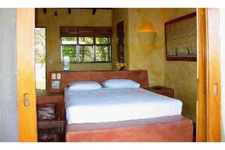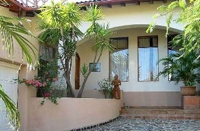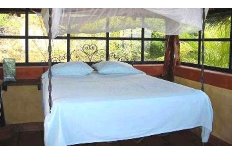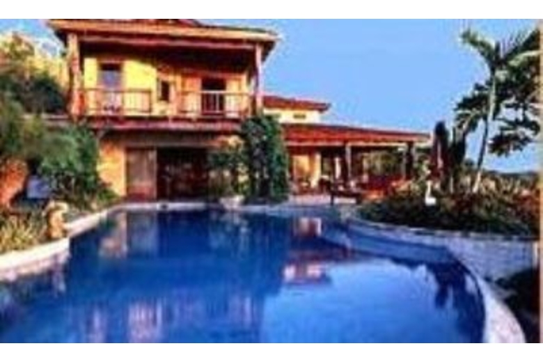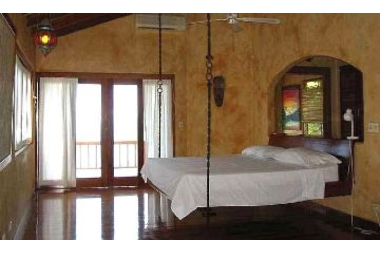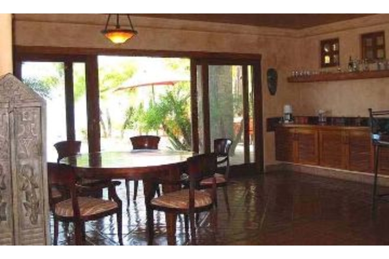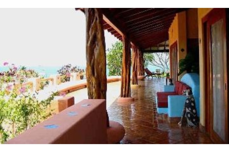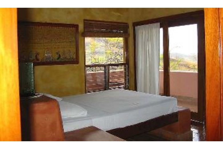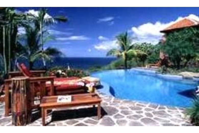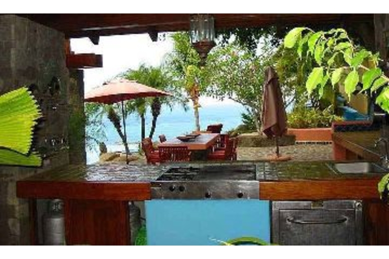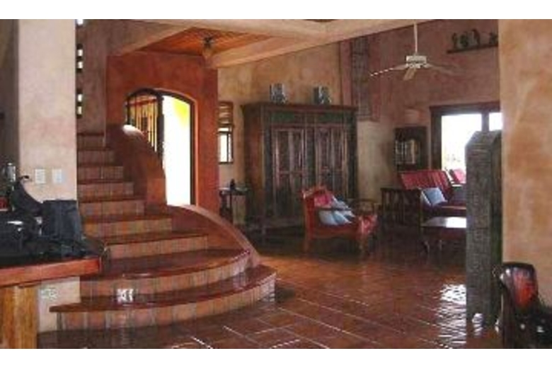 On the ocean side of the villa is a flagstone Spanish style courtyard with a fountain, and a large tiled terrace area. There is a tiled "infinity" pool facing the ocean, surrounded by exquisite landscaping and a large outdoor BBQ/cooking area, with a gas oven. The high vantage point offers unparalleled views south to Playa Langosta and north to Playa Grande. The Mexican-tiled kitchen is fully equipped and opens to large dining/living area. The entire living/dining area is screened in and opens onto the terrace. Just off the kitchen is a tiled staircase leading to the master suite and bath. The luxury master suite features a king size bed, air conditioning, bath with marble tub and counters, and a rosewood dressing table in the bathroom. The balcony off the master suite overlooks the pool and garden and affords an even grander view of the surrounding area.Surrounding Description