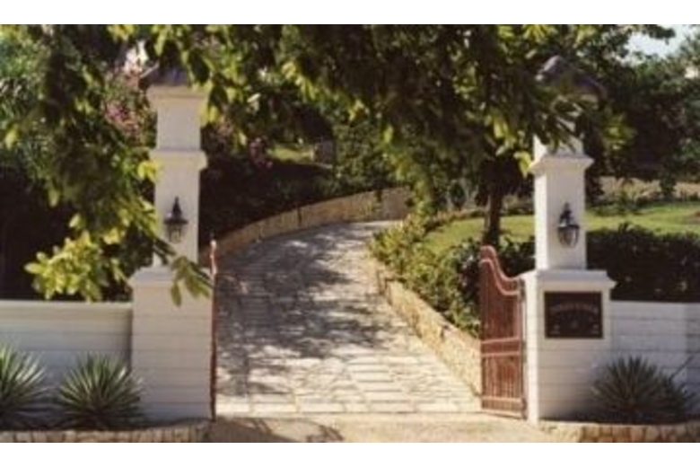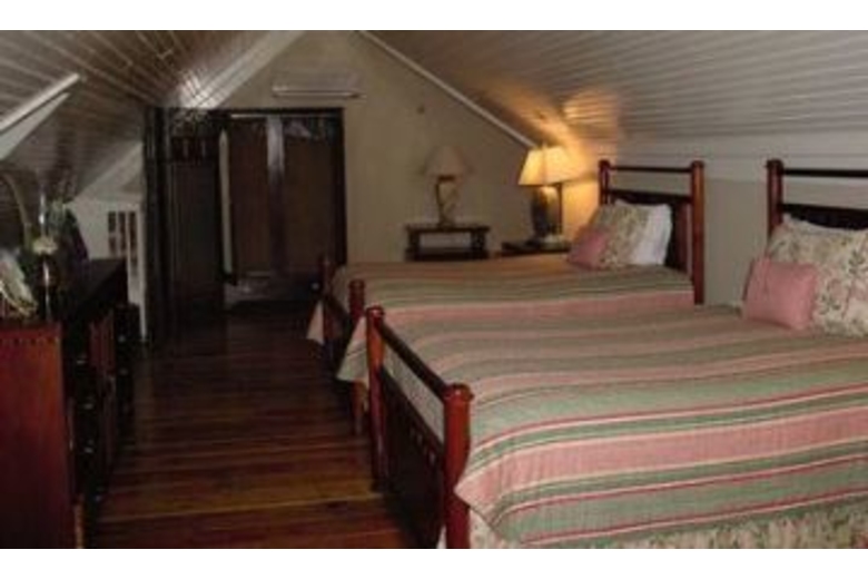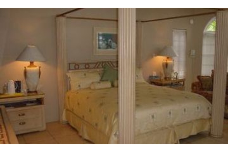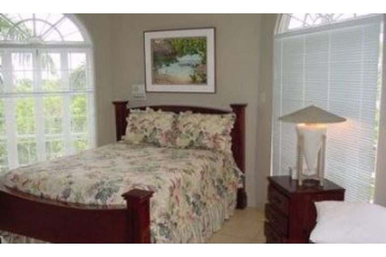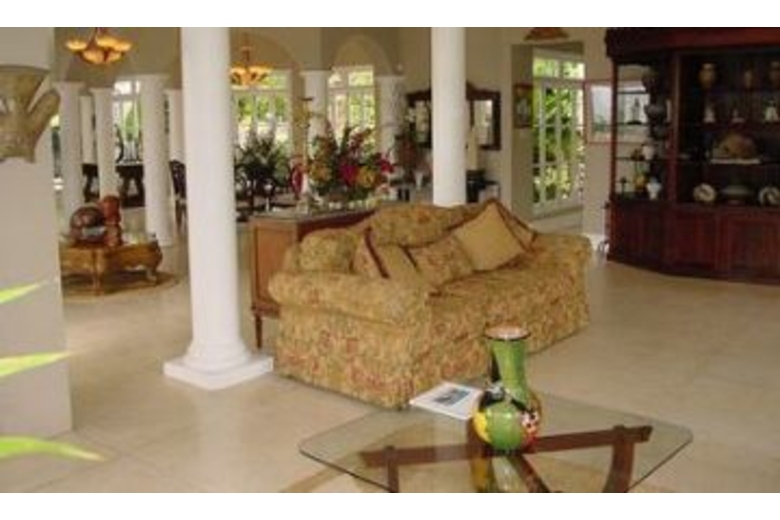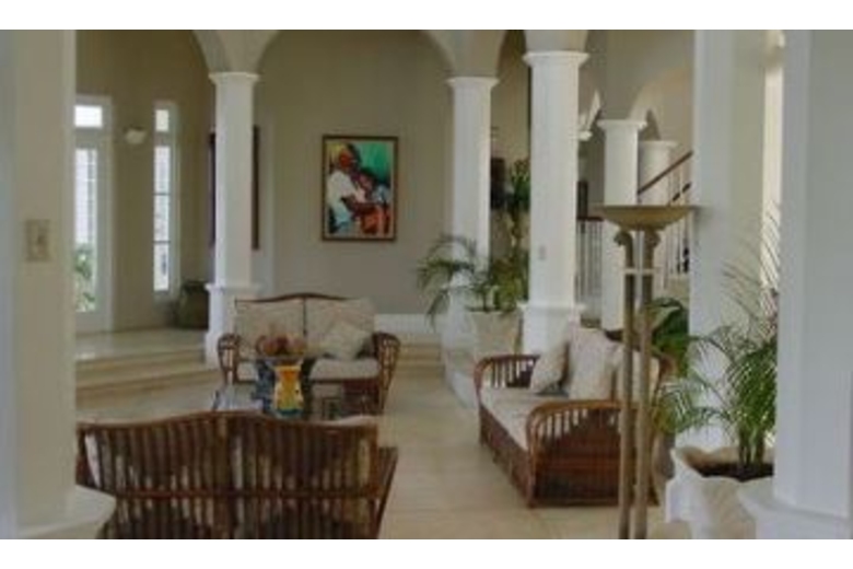 A wall of glass doors open from the gallery as well as from all of the bedrooms to the deep wrap around verandah which offers panoramic vistas over the golf course and the turquoise waters beyond. The interiors feature taupe colored walls crisply trimmed in white. Mediterranean styled floors were custom made on site and provide an overall palate of soft colors. The furnishings feature a tasteful and eclectic mix of upholstered pieces, tropical rattan accents and contemporary accents. Bose speakers provide surround sound in the villa, verandahs and pool area and enhance the overall ambiance.The home is built on two levels and offers a main house and a carriage house. The main floor features the expansive living and dining areas as well as one of the bedrooms that has a queen sized bed, en-suite bath and furnished patio with ocean view.Three additional bedrooms are located on the upper level. The master suite is large and features vaulted ceilings, a king sized four poster bed, en-suite bath with whirlpool tub, large walk in shower and a delightful and private furnished balcony with ocean views.The two additional upper bedrooms both offer queen-sized beds, en-suite baths and furnished balconies with ocean views. There is a connecting door between these two bedrooms.The two remaining bedrooms are located in a garage apartment that connects to the master bedroom as well as to the kitchen via a back stairway. These two additional bedrooms are less deluxe than the other bedrooms and are, therefore, more suited for children and teens. One of the bedrooms has plank floors, two double beds, sloped/eaved dormer roof, small bathroom and connects to the master suite. The other bedroom has two twin sized beds and a hall bathroom and is the smallest bedroom in the villa. An additional living area is located between these two garage bedrooms and offers TV and a stairway to the kitchen.Surrounding Description