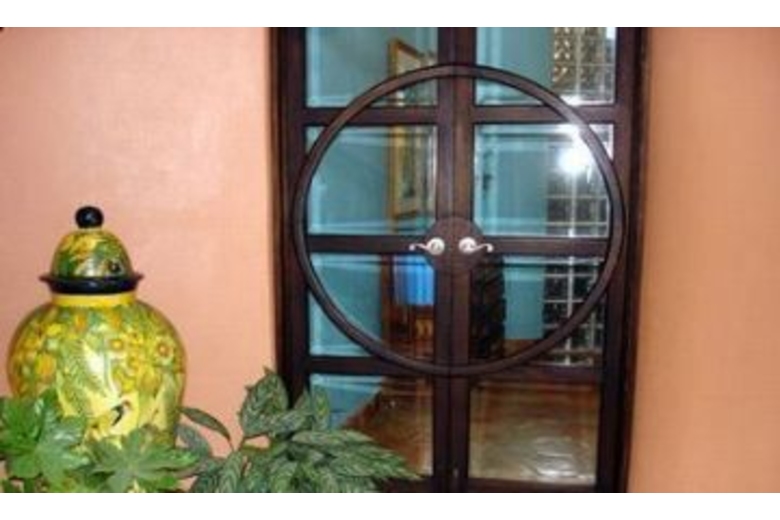 The circular theme is found throughout the house and its three towers. Enter from the street down a few steps to a circular courtyard. An elegantly designed door opens into the foyer and stair tower containing carved wooden steps that spiral up to the second floor's en suite bedrooms and additional living room with large-screen TV.