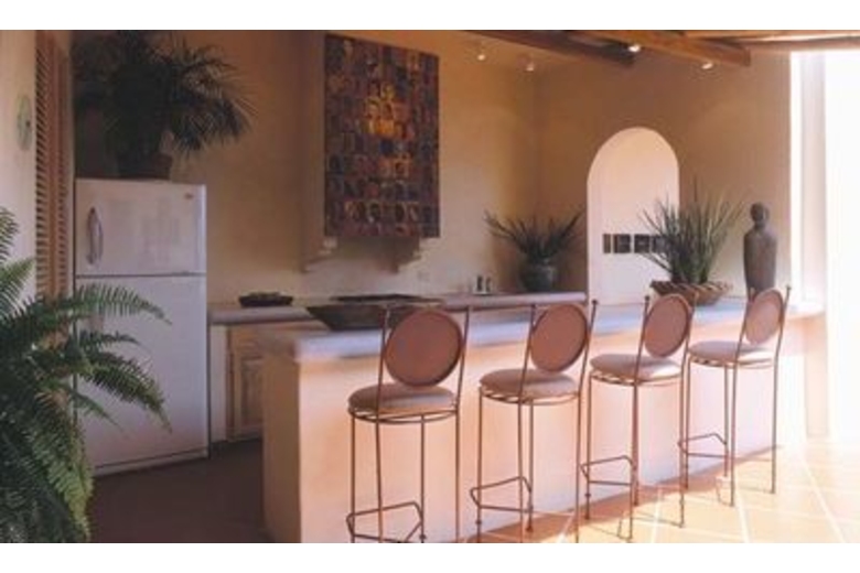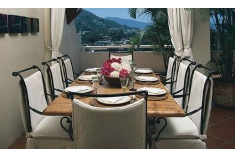 This four bedroom downtown home has spectacular views of the town and Banderas Bay. Each of the sitting areas and bedrooms is unique in style and color, making good use of original art and locally found antiques. The master suite features a fireplace, sitting room and an office area. The master bathroom has an open-air bathroom and matrimonial sunken tub with French doors that open to the garden and Jacuzzi terrace. The three other bedrooms are on the entry level - 2 with queen beds and 1 with twin beds - all with private bathrooms and air-conditioning. The living, dining, kitchen, sitting areas and a spacious big patio are also on this level. The Jacuzzi/splash pool holds 8 people and the sun deck with chaise lounges and tables is ideal for lunch or drinks. The house comes with a full staff to pamper you on your dream vacation.Surrounding Description