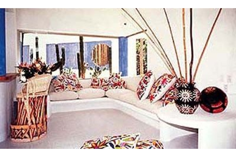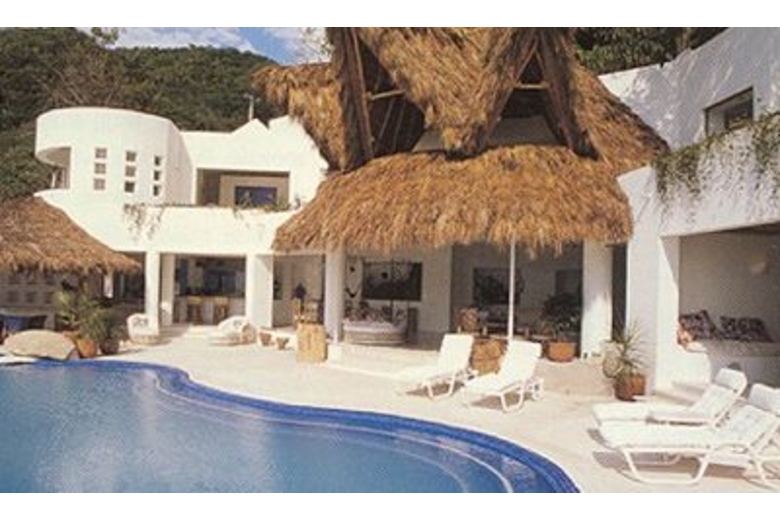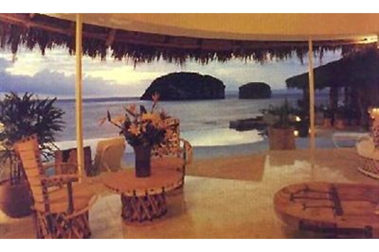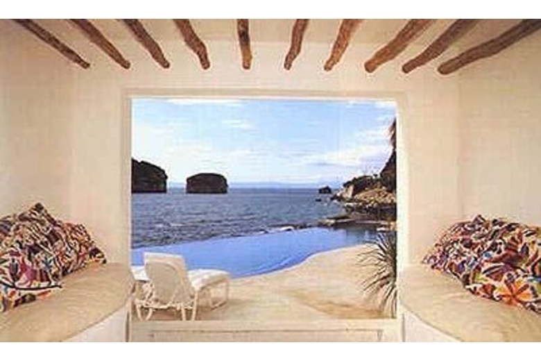 The focal point and highlight of Casa San Sebastian is the circular palapa-covered living room with its 180 degree panoramic vista of the sea and Los Arcos, the offshore trio of massive boulders that jut from the sea to form Puerto Vallarta's best known landmark. The spacious living room, its adjacent open dining area, and an ocean side gathering and entertainment terrace with its own palapa overlook a jacuzzi and fifty-foot long infinity pool, strategically situated to create an illusion of ocean and pool blending into a spectacular vista of gently crashing surf and offshore rock formations.Luxurious white marble floors are outlined with traditional pebble designs and hand-set in concrete by native artisans who used more than 100,000 tiny stones to complete their mosaic. Windows, wherever used, are situated for a single purpose, to emphasize the spectacular vistas offered from every vantage point. The four bedrooms, outside palapa-roofed entertainment area, TV room, breakfast area and modern American-style kitchen are all situated to overlook the Pacific, Los Arcos, and stunning oceanside cliffs.The peak of the soaring palapa is 35 feet above the living room floor and its thatched palm roof is of a weather proof design with a hidden concrete liming designed to cool the interior and reduce maintenance. The peaked interior of the palapa dominates the living area, its angular ceiling lined with over 3,000 bamboo reeds harvested from nearby jungle hillsides and individually nailed in place by native workers.Inside Casa San Sebastian two half-century old hiquera (fig) trees form an integral partnership with this split-level residence, their gnarled trunks jutting upward through white marble floors and specifically-wrought ten-foot ceilings. The hiqueras massive umbrella-like limbs structures dominate the angular palapa peak and stand guard over the villa, combining simple shade from the tropical sun with a sense of centuries-old permanence.Vivid Mexican floral colors, pinks, blues and yellows, have been strategically used to highlight and create interior drama. Such accent colors are favored in this new architectural style because of their affinity with the surrounding environment and because the colors offer a whimsical contrast with the white walls and blue-sky open-aired feel of the palapa.The architect Alberto Alvarez, a local award winning University of Guadalajara graduate, adopted the Pacific Coast style with grace and ease, and added his own particular creative touch resulting in a dramatic and spectacular residence. Comfort and luxury were always on our minds. The villa provides a happy, relaxed, leisurely setting, a place to recharge, to revitalize.Surrounding Description
