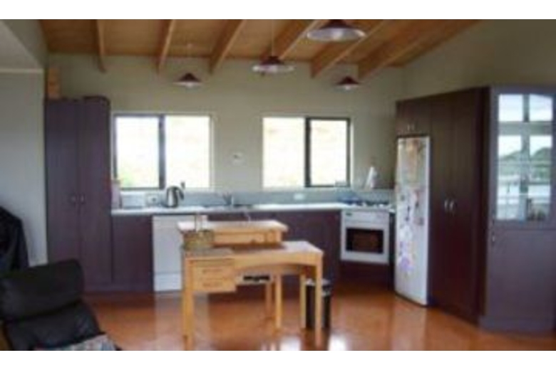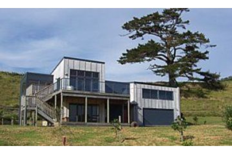 A two-storied modern holiday house situated north facing, on a slightly elevated section, in a new subdivision in Kuaotunu, only 200 meters to the sea. It commands views of the Black Jack hill and glimpses of the ocean, Mercury Island and the northern end of the Coromandel Peninsula (Colville).
