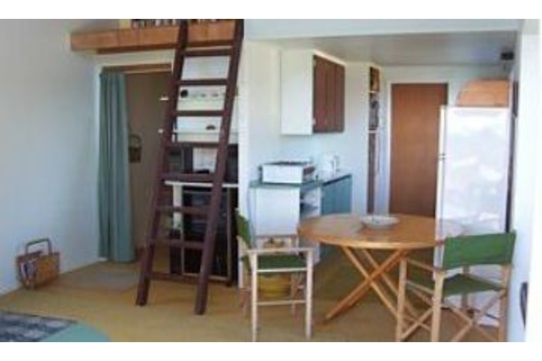 The bach is situated on a grassy knoll above Kuaotunu Beach at the highest point of a very quiet cul de sac. There are no immediate neighbors. The property is bordered to the north by council reserve land planted in shrubs, to the south by a vacant section, west is farmland and to the east the Pacific Ocean. There are unimpeded 180-degree views of the ocean, offshore islands and the coastline in both directions. There are no private properties in front of the bach between it and the sea. The access to the beach is via a steepish path at the bottom of the cul de sac.
