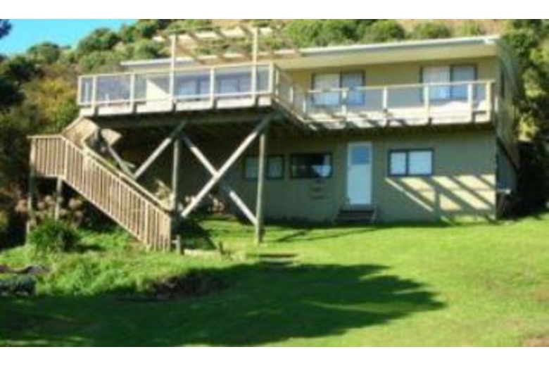The bach is a two-story house situated 150 meters from the beach and has decks on 3 sides of the upstairs main living area. The house is on the back of a sloping section, which means the sea & bush views from the main living area cover 250 degrees. The morning sun first enters the kitchen and front deck area by 8am and leaves the front deck at sunset, providing a great “summer” feeling to the house.