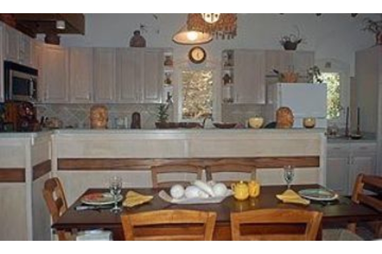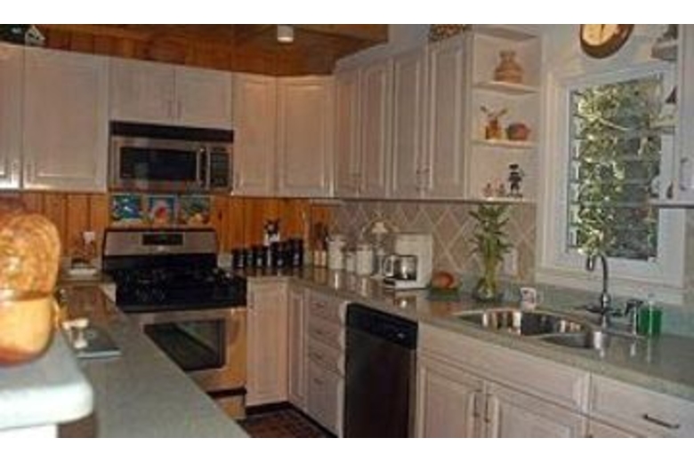French doors allow access to the covered deck from the spacious living room and the master bedroom. The high, vaulted ceilings create room for a large loft with two twin beds. The beautiful setting makes this home one of the most desirable. The newly fully equipped remodeled custom made kitchen will provide all your culinary needs. Other new additions are the hand crafted teak dinning table and chairs, wicker living room set make this a comfortable place to eat, read, watch TV or just relax. The lower level has two bedrooms with queen beds. 1 bathroom. The pool and deck are perfect spot for sun bathing by day and star gazing by night.Surrounding Description