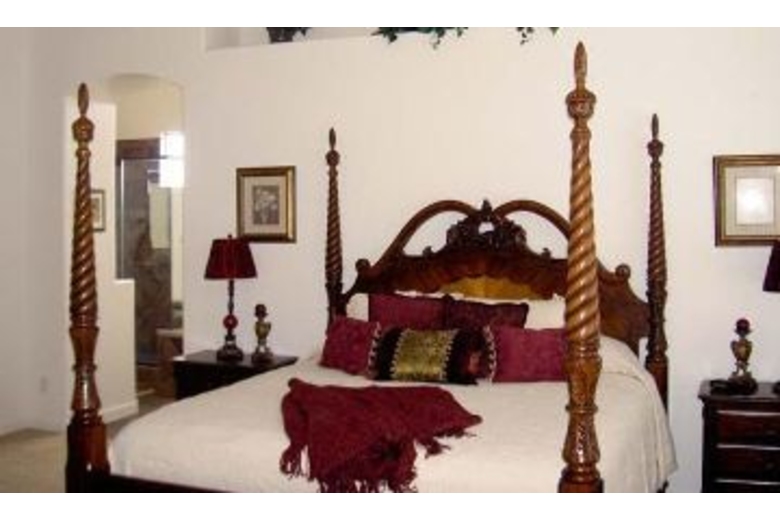 Watch the sun drop down behind the mountains from your covered patio. The entrance to the home is through a large gated courtyard. The home was built next to a knoll so you only have one home next door to you. Backyard faces northwest and receives plenty of sunshine through out the day. Master bedroom has a king bed, cable tv, private sitting area with doors that open up to the courtyard. Second bedroom has a queen bed. Third bedroom has two twins and the guest casita has a queen bed. Enjoy the pristine desert views. The community has a heated pool and spa, exercise facility, BBQ's and a large outdoor fireplace.Surrounding Description