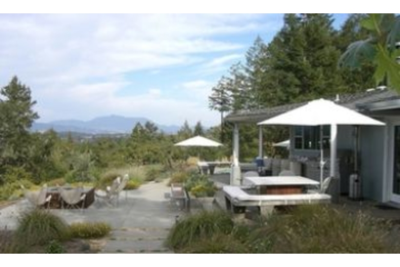 Located just seven minutes from Central Healdsburg downtown Plaza Square, this retreat offers seven acres of wonderful gardens and breathtaking views. There are three notable areas on the property, one being the main home, to the right the guest house, and to the left the play area.